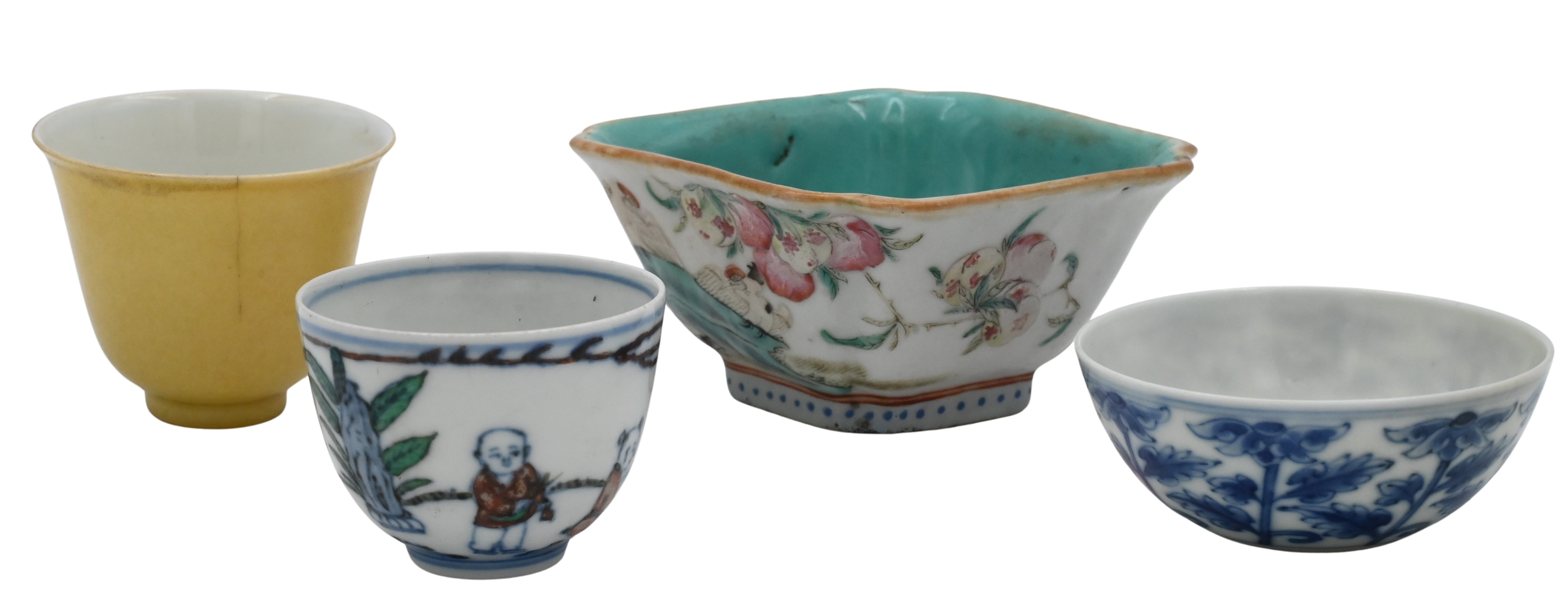 to include blue and white linear floral motif bowl with six character marks, blue, green, and red teacup featuring boys playing with character marks, yellow ground footed teacup with out turned lip and character marks along with square Famille Rose bowl featuring peaches, branches, and two heron / stork like birds