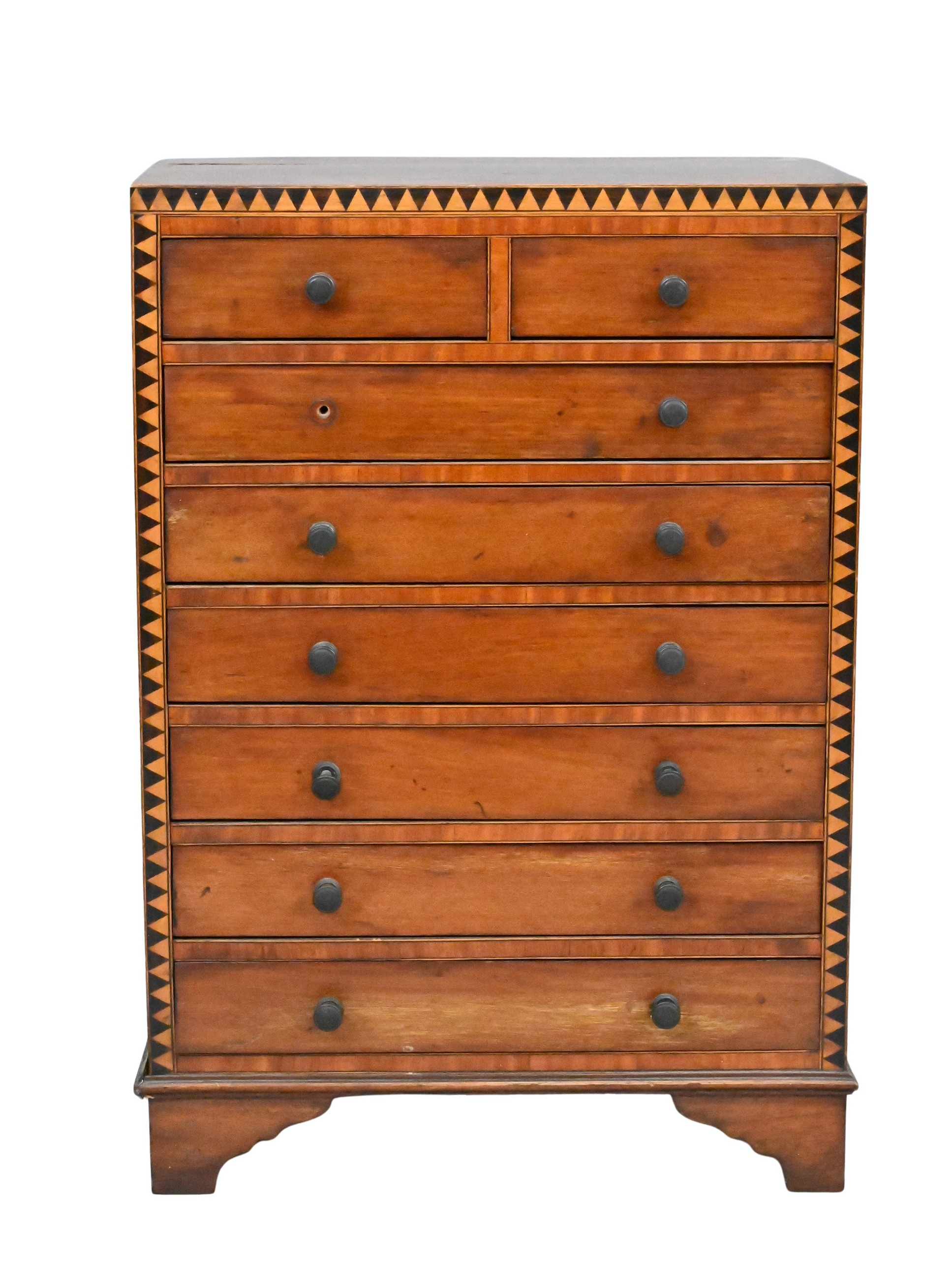 Rectangular tan-colored marble or granite top above two frieze drawers and two long drawers finely mounted with gilt-bronze inlay, including diamond-patterned ornament, rosette and beaded mounts, and fluted corner stiles; raised on tapered legs ending in gilt-bronze sabots. The reverse bearing a chalk inscription “A D Room.” A refined example of late 18th-century Parisian cabinetry, consistent with the elegant neoclassical forms, mahogany veneers, and high-quality ormolu mounts associated with Saunier’s workshop and with furniture produced for leading marchands-merciers such as Dominique Daguerre