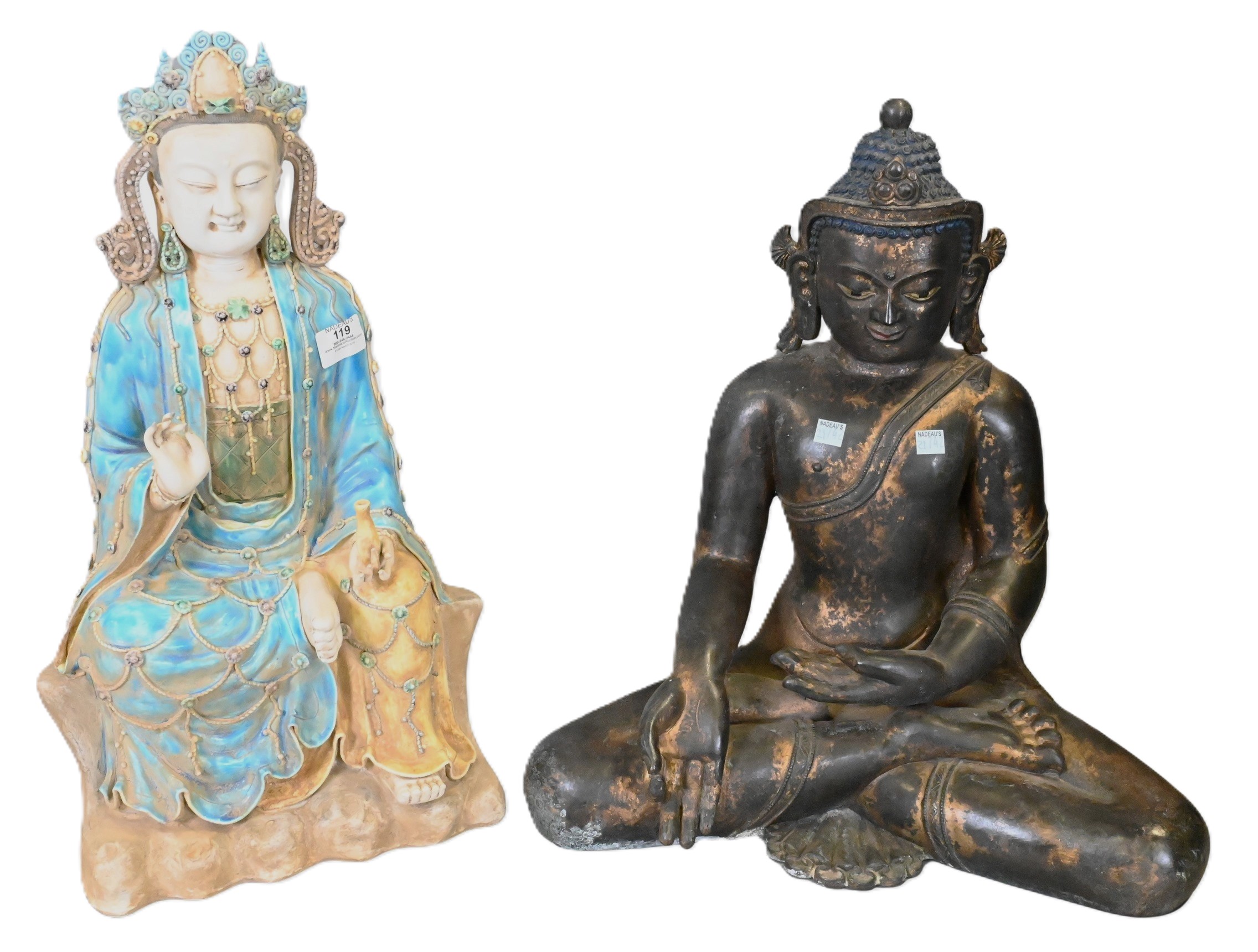 to include Chinese Liao style Sancai Guanyin featuring the seated Buddha-like figure adorned in crown and jewels holding a small vase and seated on a rocky throne, along with gilt bronze Buddha in Southeast Asian style having painted eyes