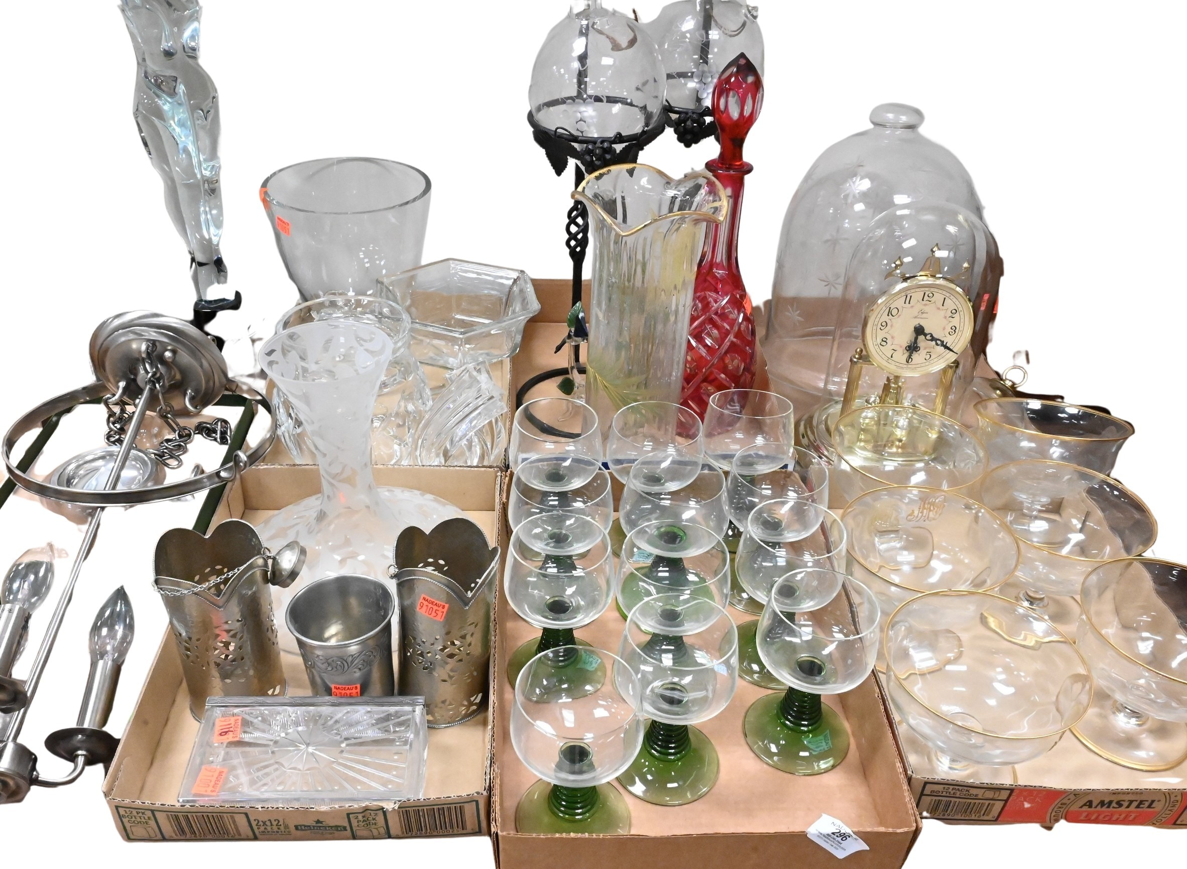 cranberry cut glass decanter, Art Nouveau gilt rimmed fern vase, six gilt rimmed shrimp cocktail stems, two hanging wine decanters with metal grape vine body, Hawkes cut glass box with sterling hinge, Steuben vase etc…