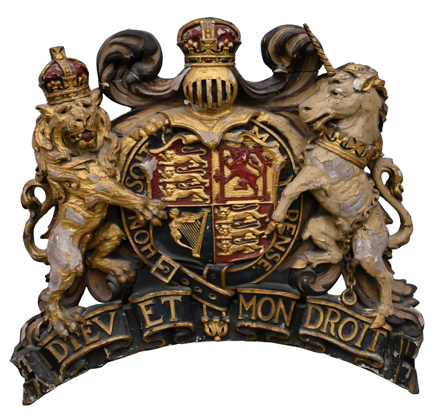 Boldly carved and painted wooden crest depicting the Royal Arms with lion and unicorn supporters, crown, and mottoes “Dieu et mon droit” and “Honi soit qui mal y pense” Likely produced for civic or ceremonial display, in the tradition of heraldic panels made for guildhalls and municipal buildings