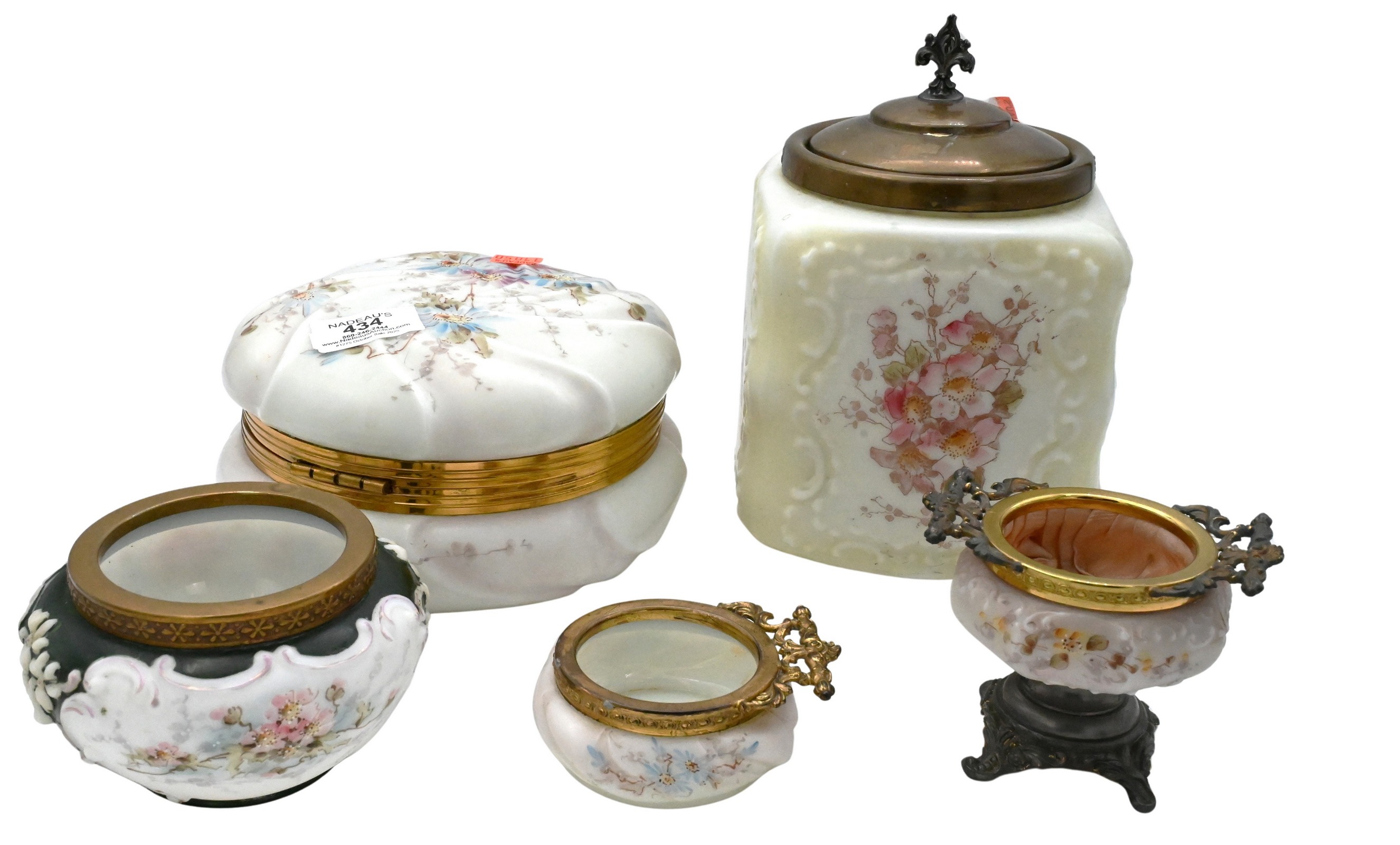 Table lot of china, glassware, chimneys, four part dish, silver plate, enameled on copper compote possibly early, brass lamps, books, hanging light, paintings and prints, early drill, misc.