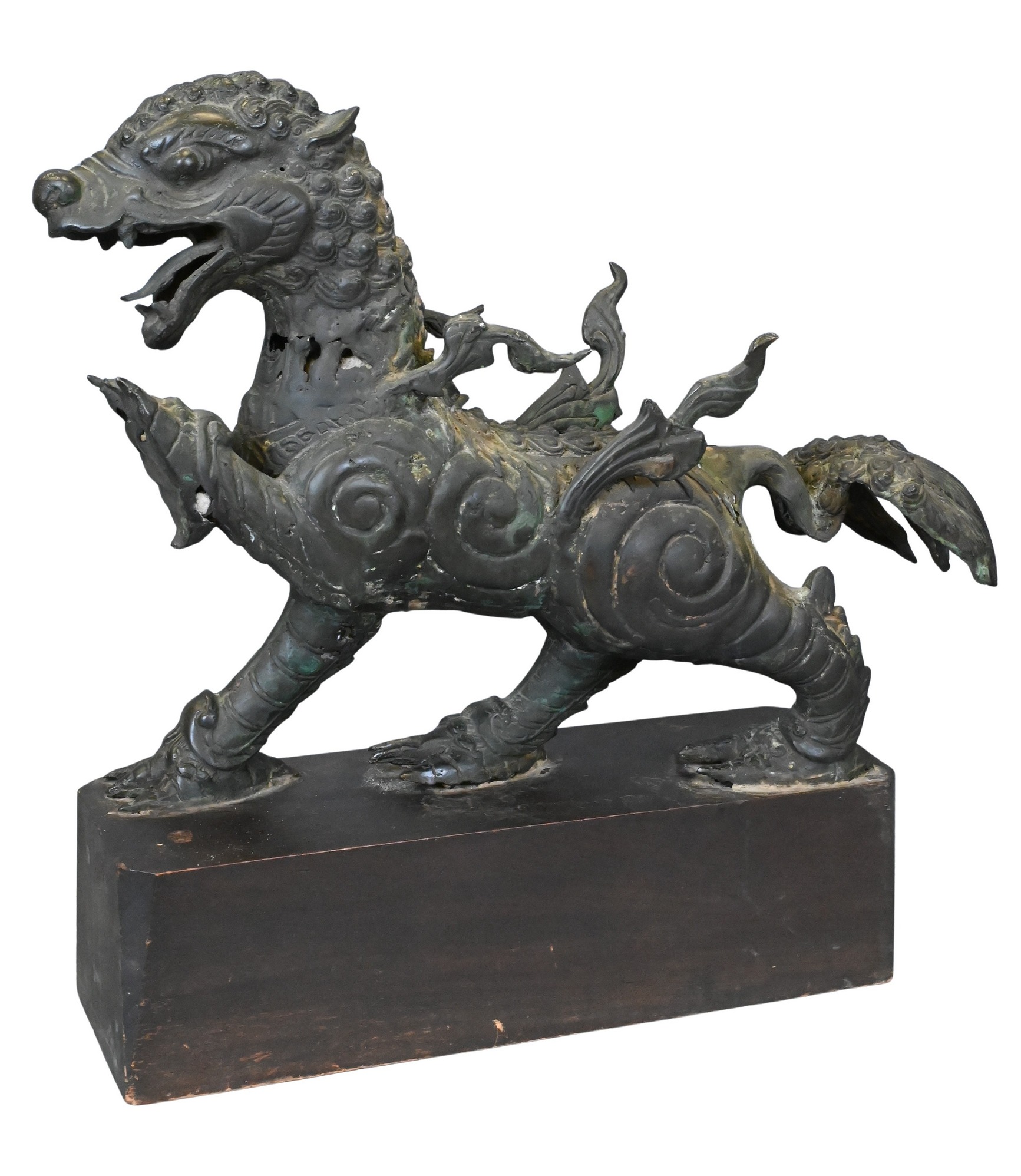 A large cast bronze figure of a dragon or foo guardian, depicted striding with open jaws, curled mane, and detailed scales and tail, with swirling cloud-like motifs to the body. Dark patinated surface. Mounted on a later wooden plinth.