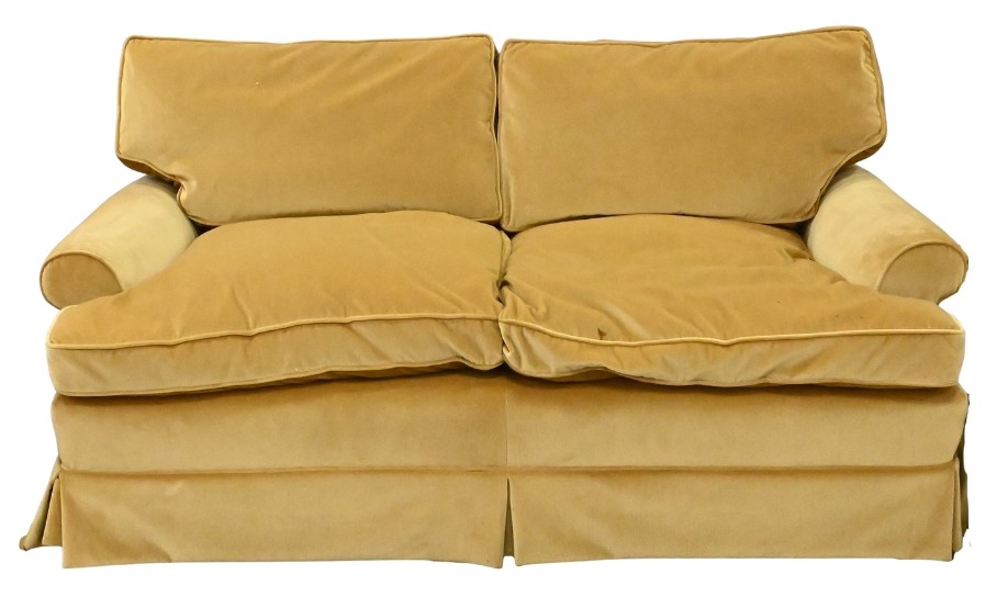 Lot 438: Tan leather upholstered loveseat. lg. 72in.