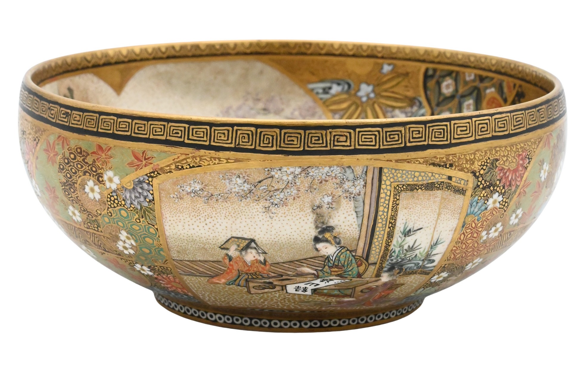 A finely painted Japanese Satsuma bowl, the interior decorated with an elaborate figural scene of scholars and attendants in a pavilion and garden landscape, with gilt and polychrome detailing throughout. The exterior panels with alternating floral and figural reserves, all within gilt borders. Signed on the base in gold characters within a cartouche.