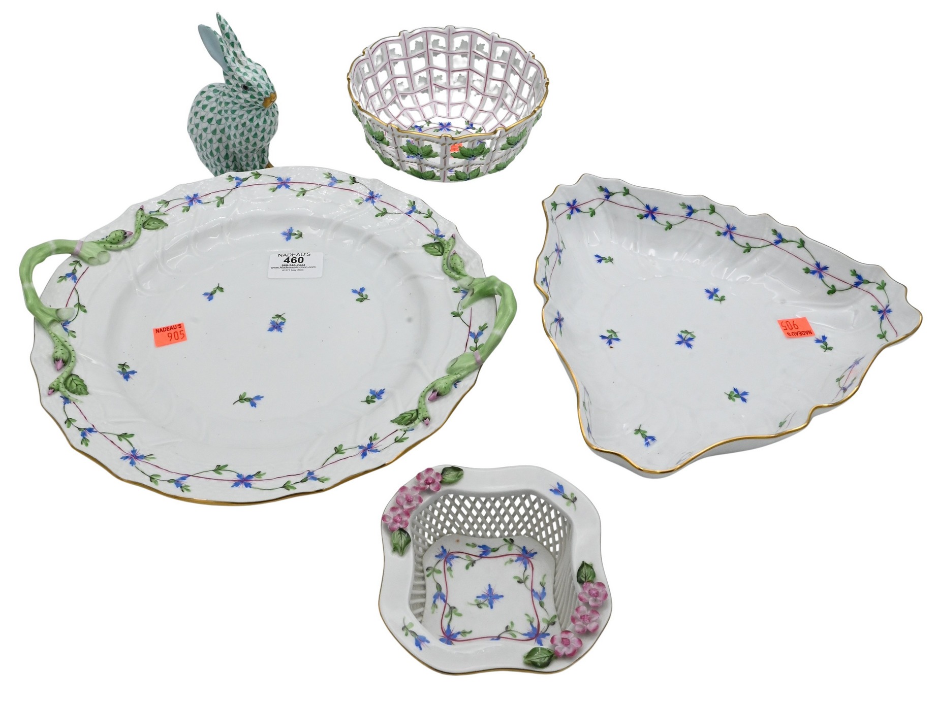 to include green fishnet bunny rabbit, basket, reticulated bowl, small square reticulated basket bowl, triangle serving dish, and double asparagus handled plate