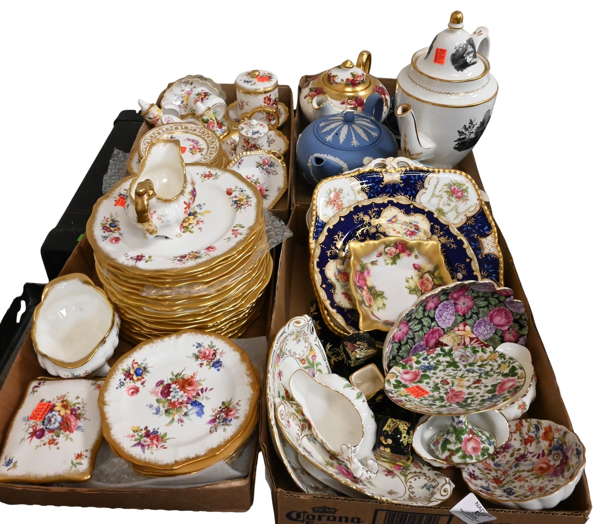 Table Group, to include crystal Sevres stems, Val St. Lambert coasters, Chinese porcelain plates, Chinese porcelain vase, decanter set in box, leather books, four Boehm flowers in boxes, large tapestry, mug marked with crossed swords, doll house furniture, etc.