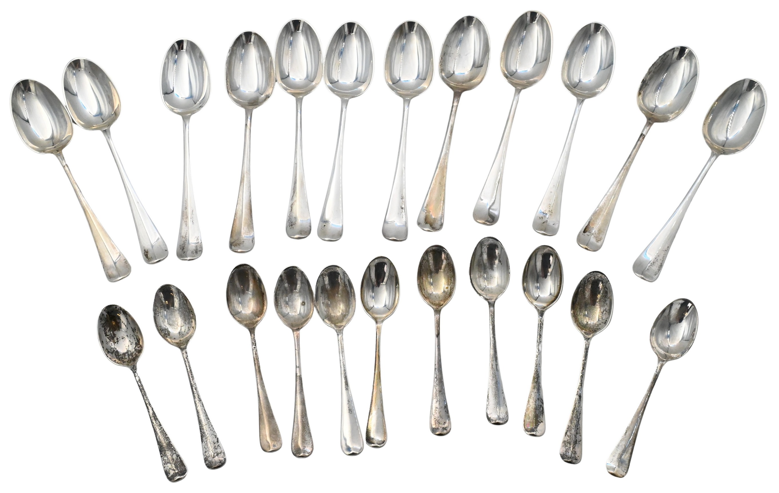each shaped terminal having scrolls, to include 10 dinner forks length 8 3/8 inches each, nine luncheon forks length 7 inches each, twelve fish forks 7 inches each, nine bouillon spoons length 8 1/4 inches each, four teaspoons length of 5 3/4 inches each, twelve fish knives length 8 1/4 inches each, six stainless steel bladed luncheon knives length 8 1/4 inches each, one pastry slice length 10 3/4 inches, one fish slice length 11 inches, one soup ladle length 12 1/4 inches, 11 demi spoons, 12 place spoons, two large cocktail forks, one large serving spoon, one large serving fork, one salad fork, one salad spoon, one two prong fork, one large bouillon spoon
