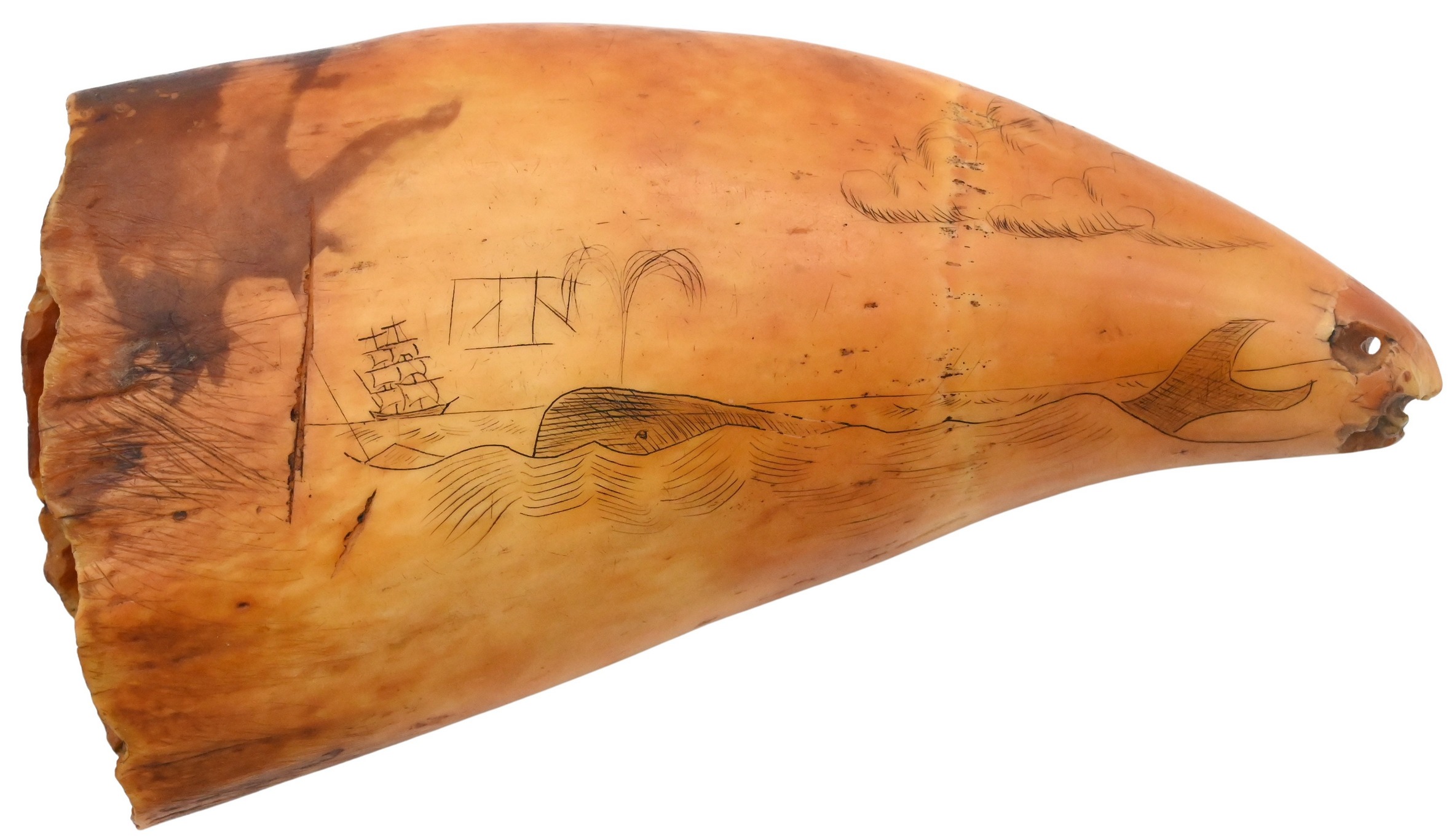 A large whale’s tooth decorated with incised scrimshaw, one side depicting a sailing ship at sea with a whale surfacing amid waves, the obverse with a small whaling boat and men in pursuit. Warmly patinated surface.