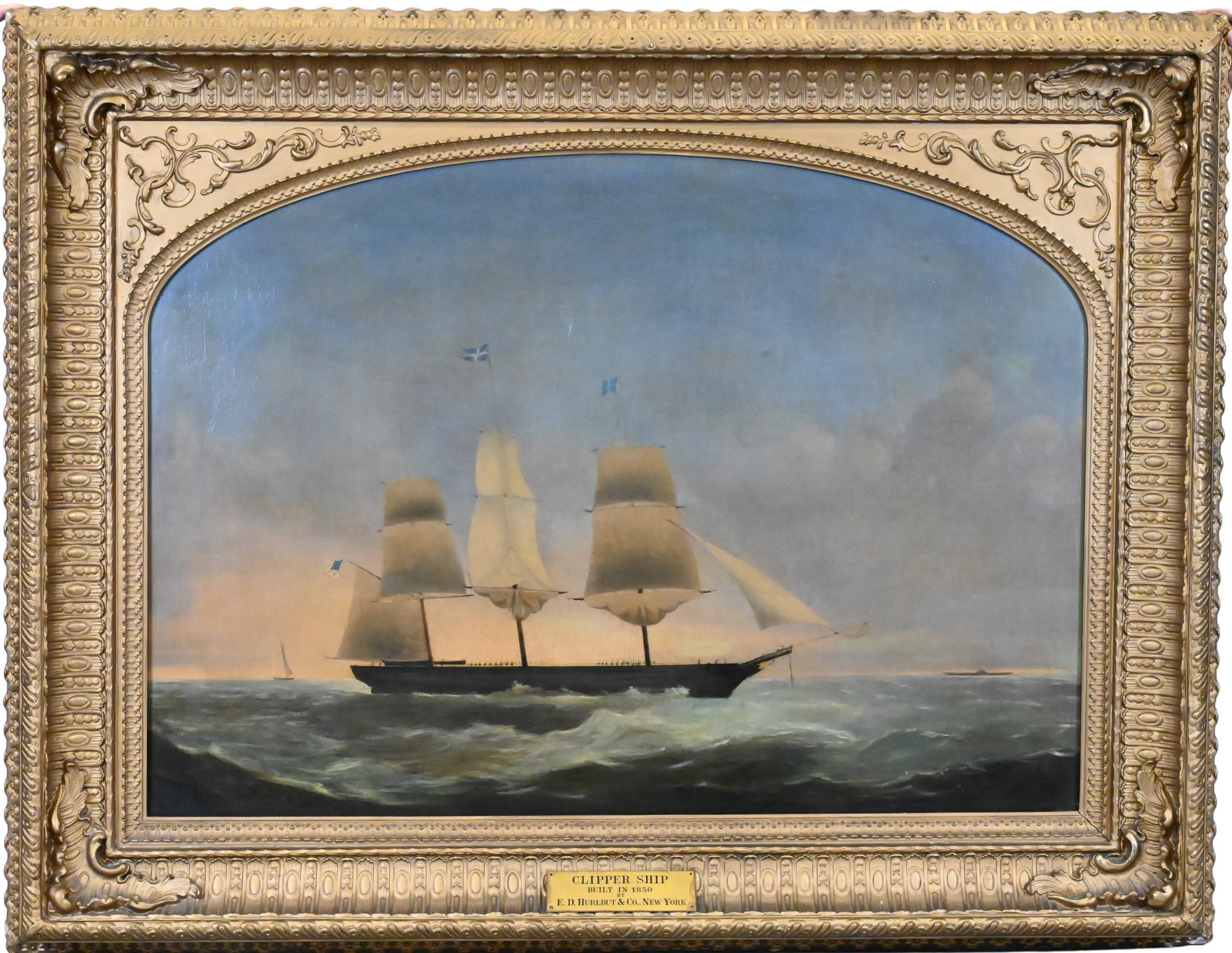 A large marine portrait, possibly the clipper Ellen Austin, depicted under full sail with identifying American flags against a cloudy sky and distant vessels on the horizon. Presented in an ornate giltwood frame with arched liner and inscribed presentation plaque inscribed “Clipper Ship / Built by E.D. Hurlbut, Albany, N. York.”