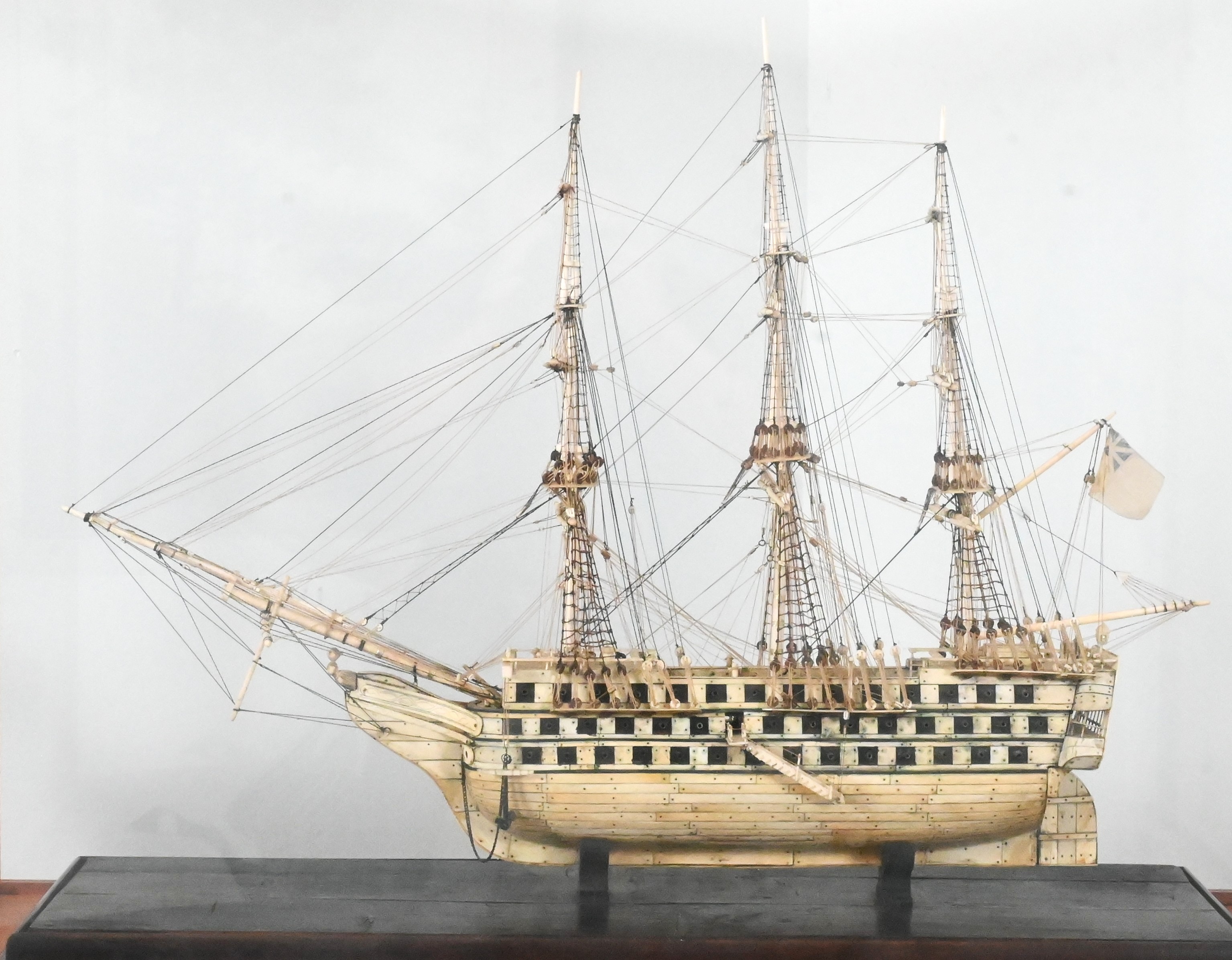 A finely detailed three-masted ship-of-the-line model with three full gun decks and rows of pierced portholes, constructed of bone with black-and-white plank decoration, flying a British Naval Jack, and fully rigged with masts, spars, and cord rigging. Displayed on a wood base within a later glazed display case.
