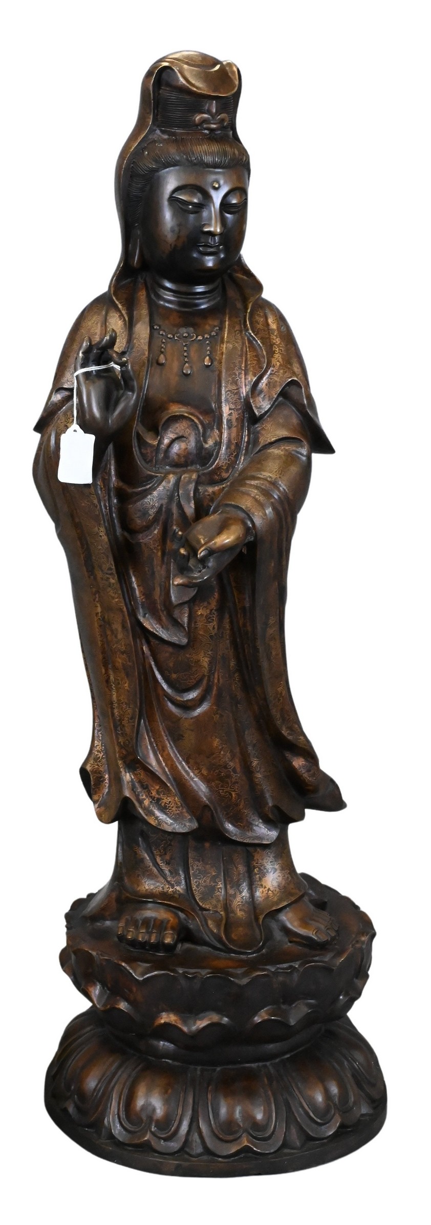 featuring the goddess in flowing gilt robes with scrolling vine motif, standing on a lotus flower pedestal