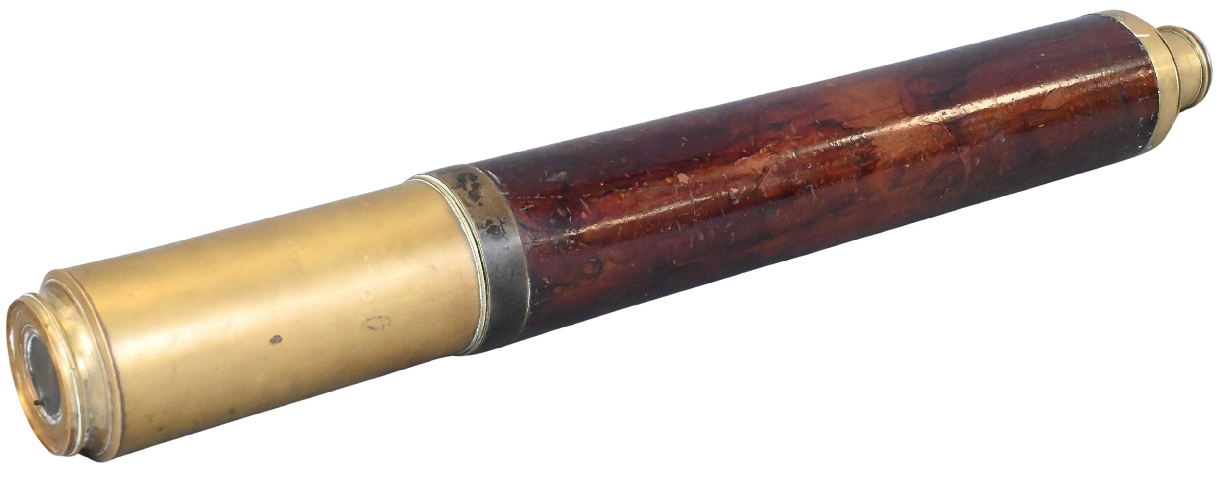 19th Century, A fine brass and mahogany spyglass, the cylindrical body clad in polished mahogany, fitted with brass mounts and sliding sunshade.