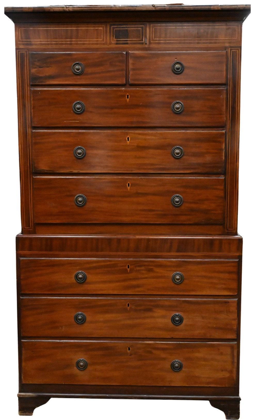having six drawers with additional two small drawers at top, diamond shaped keyholes, not original brass, satinwood inlay border, all over square bracket feet, circa 1790