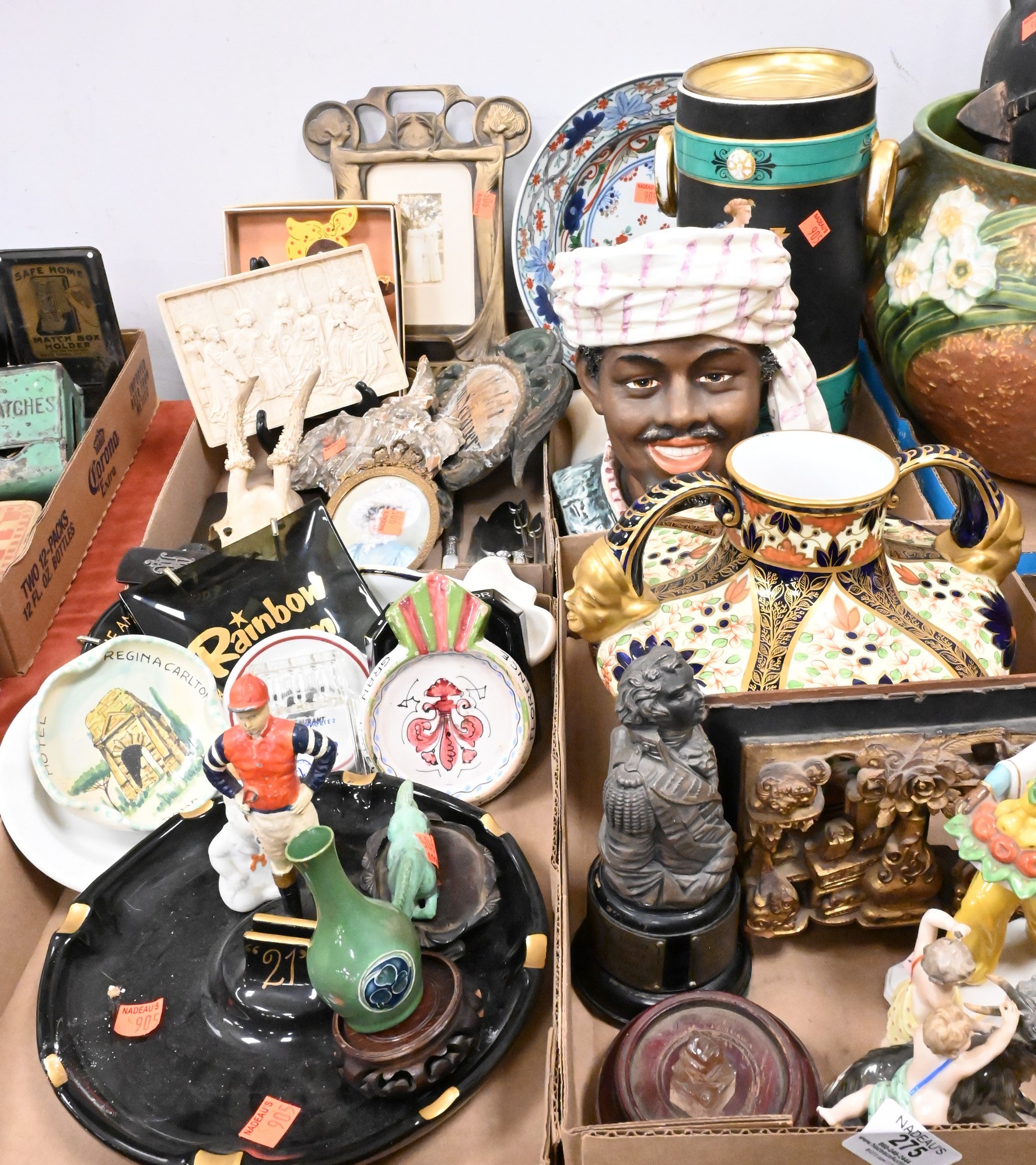 several sterling toothpicks, small knives with sterling accents, blackamoor ceramic bust, miniature Chinese porcelain, various souvenir ashtrays, large jockey ashtray, carved bone figural plaque, Welch carved and painted sign, Asian giltwood panel, Royal Crown Derby Old Imari double handle vase with figural handles etc…