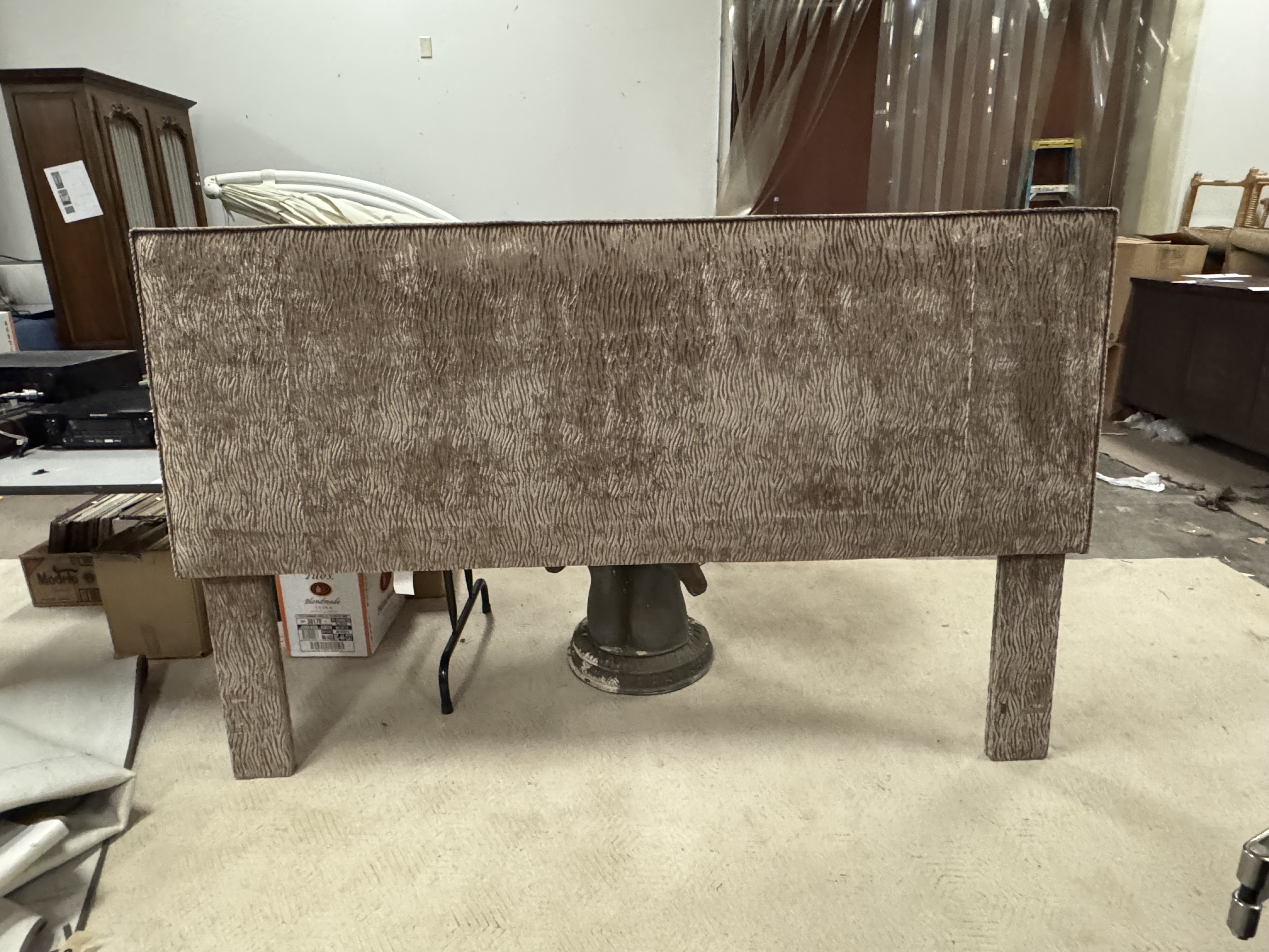 to include chest in grey having honey comb front, custom upholstered king size headboard, and one round mirror