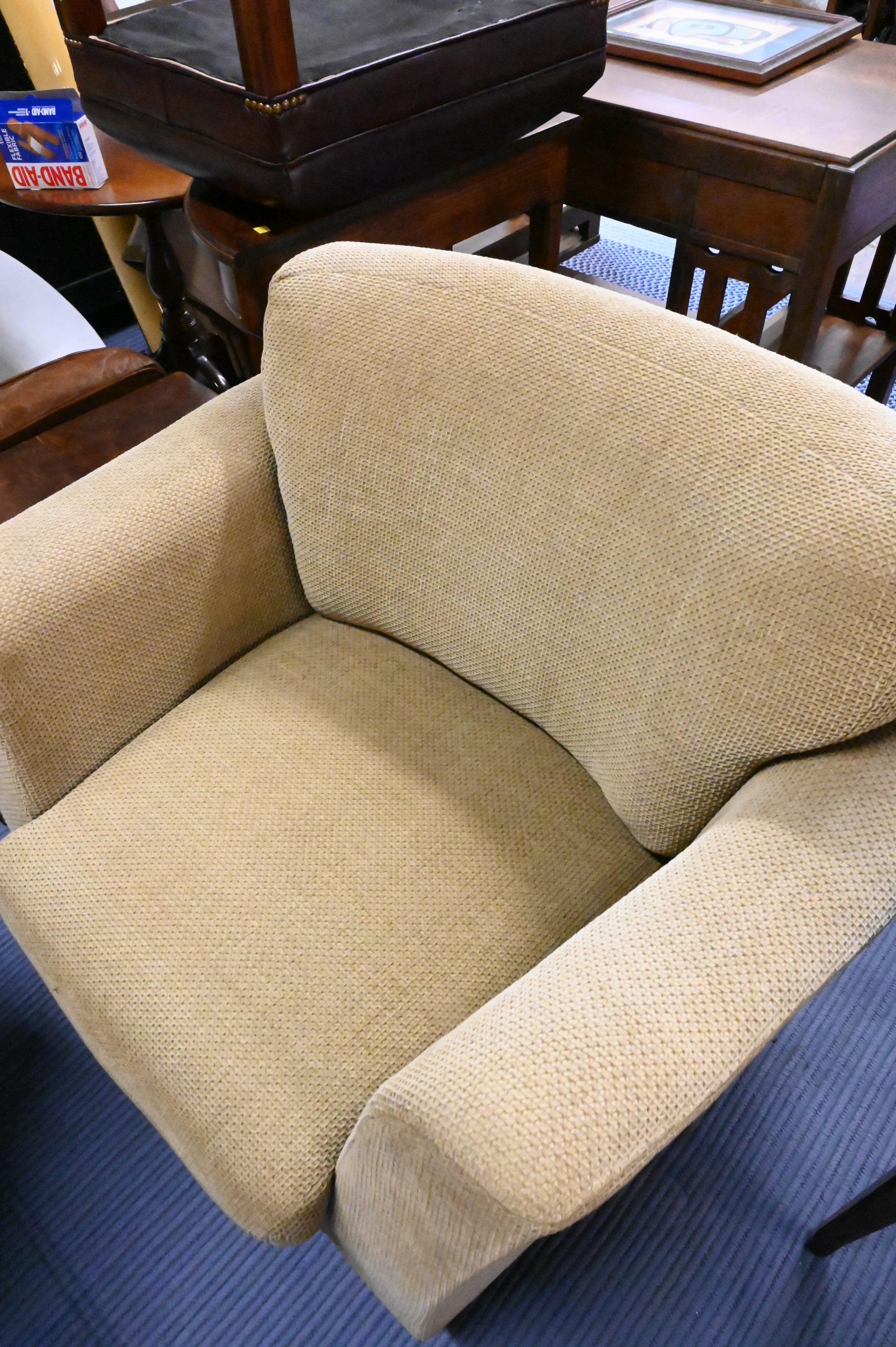 Two Piece Mid Century Modern Living Room Set, to include upholstered sofa set on short chrome legs, along with a matching club chair, sofa height 32 inches, length 82 inches.
