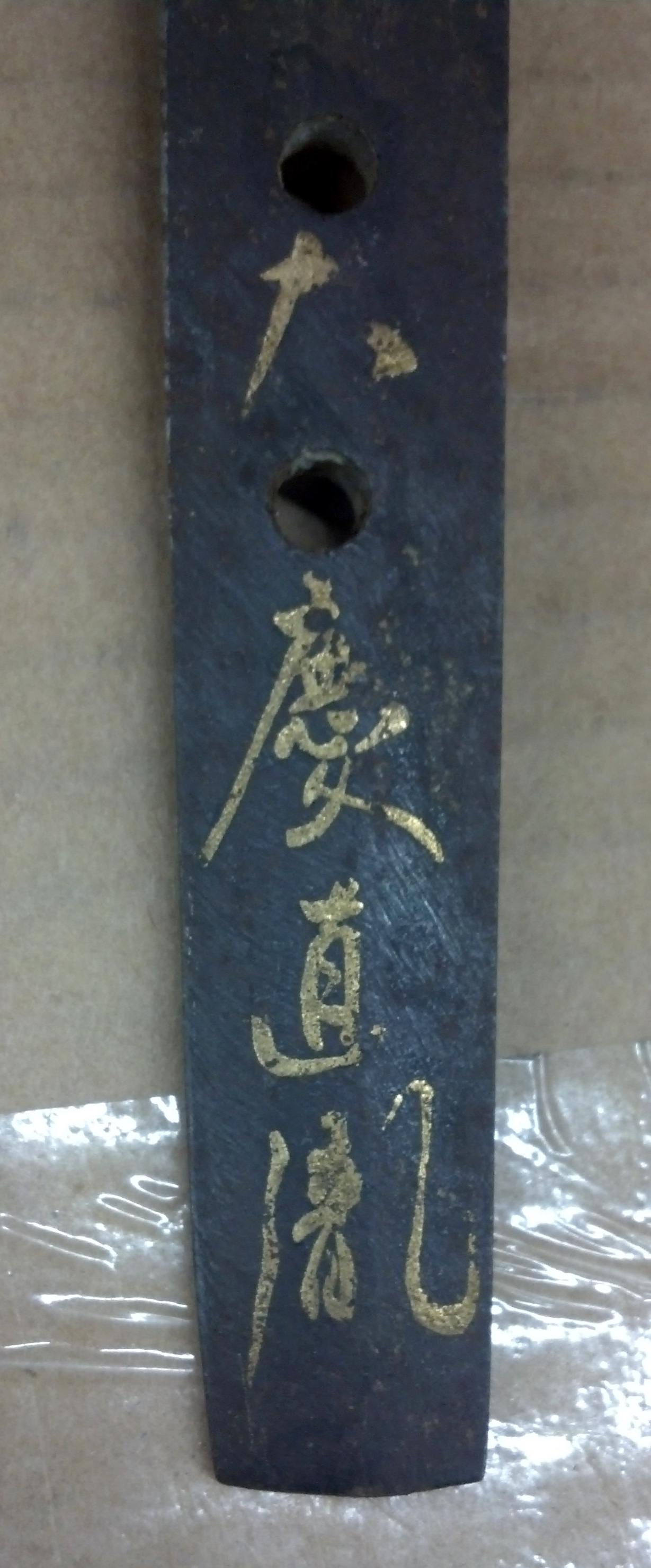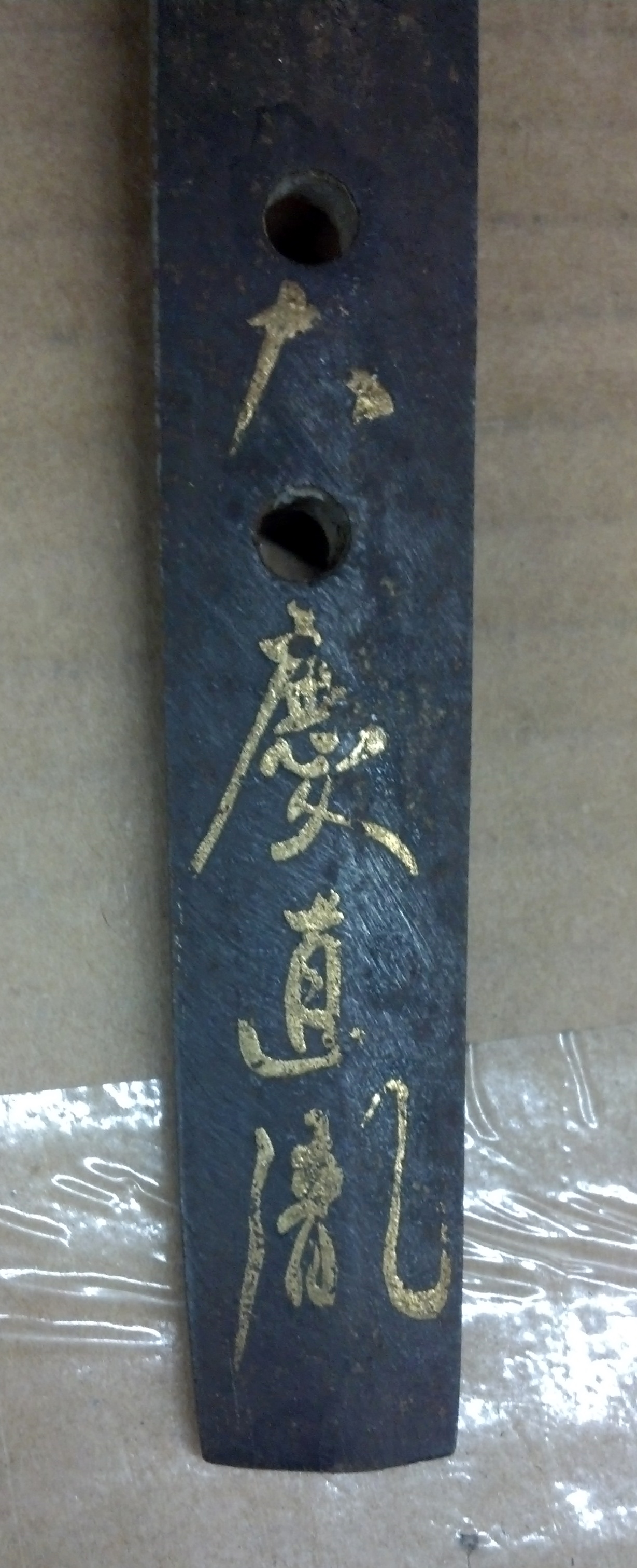 Lot 440: Samurai sword with gilt bronze tsuba and tri&cluster floral menuki, samegawa hilt, Japan, Showa in excellent condition, with gold attribution to Taikei Naotane. lg. 29 1/4in.