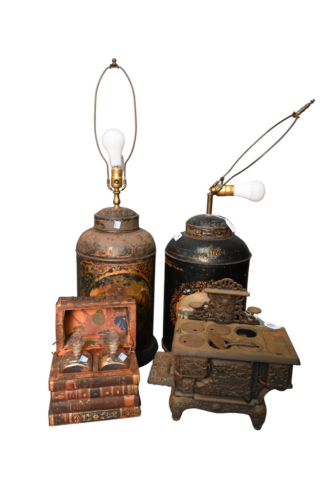 Lot 445: Pair of Tole Covered Canisters, made into lamps, iron doll stove, leather book, along with leather book decanter box, can height 18 inches. Provenance: Estate of Florence Yannios, Waterfront Home, Guilford, CT.