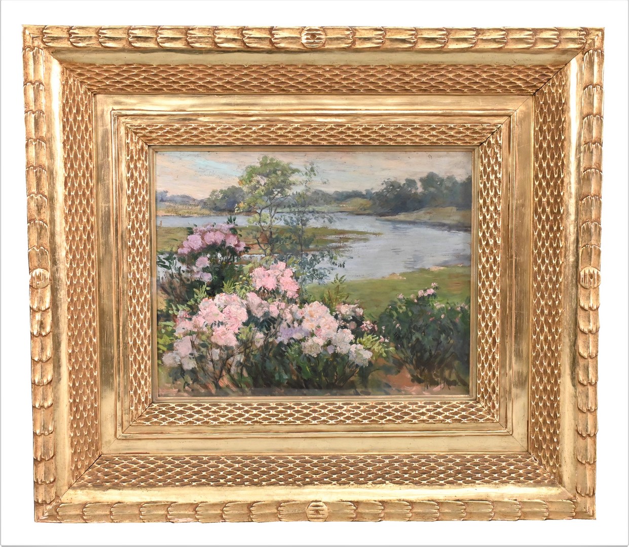 Lot 413: Matilda Browne (1869-1947) “Blossoming Flowers on Rivers Edge”
