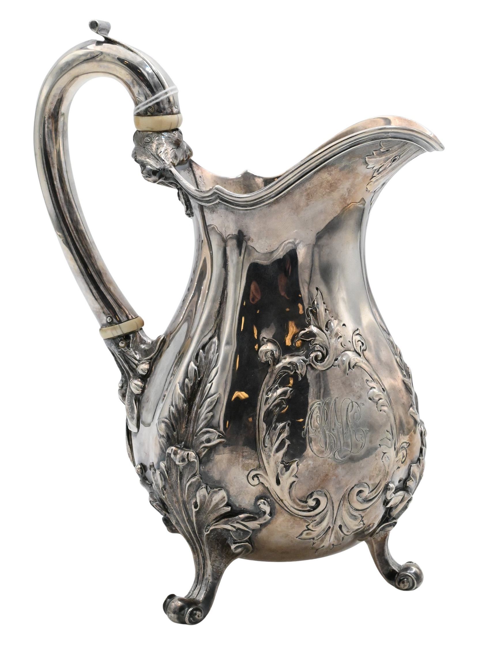 Rococo Revival baluster-form cream jug with scroll handle, repoussé and chased foliate decoration, and cartouche monogrammed CLW; raised on four scroll feet. Fully hallmarked on base for Benjamin Preston, London, 1829.