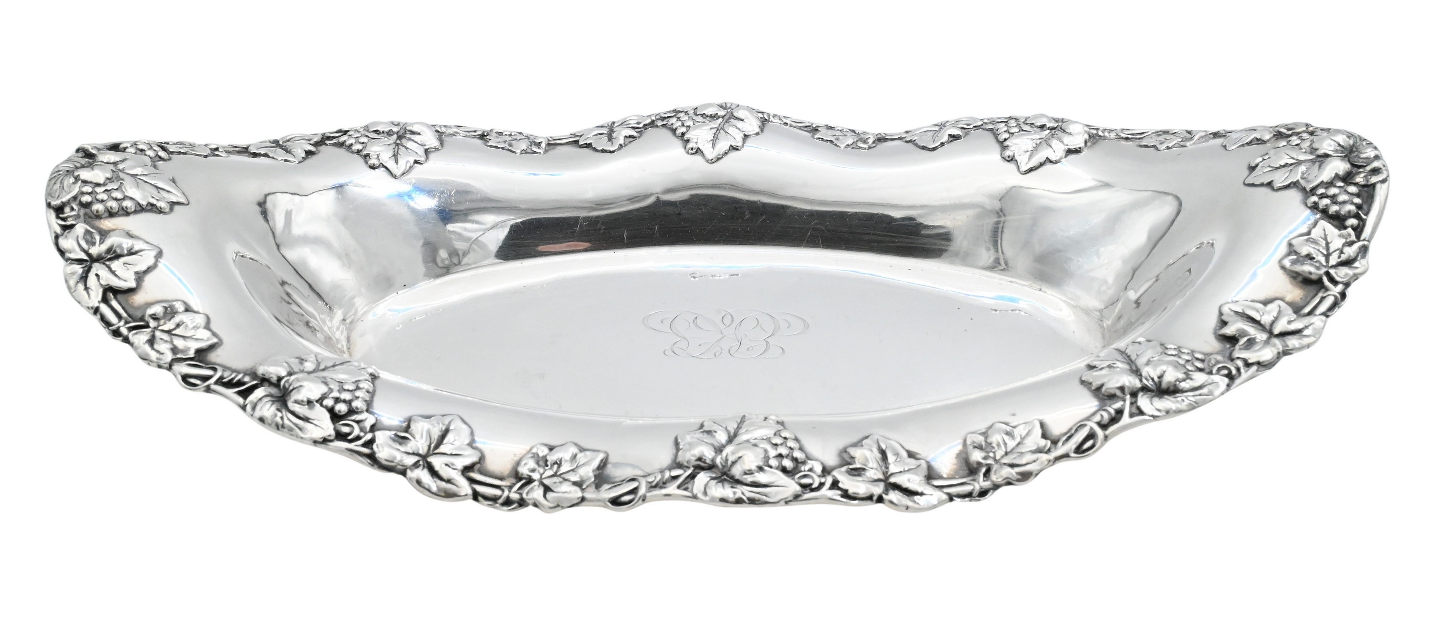 Scrolled handle and shaped rim with applied gadroon border, monogrammed C to body, raised on oval pedestal foot. Marked Gorham, Sterling, and pattern number 795.