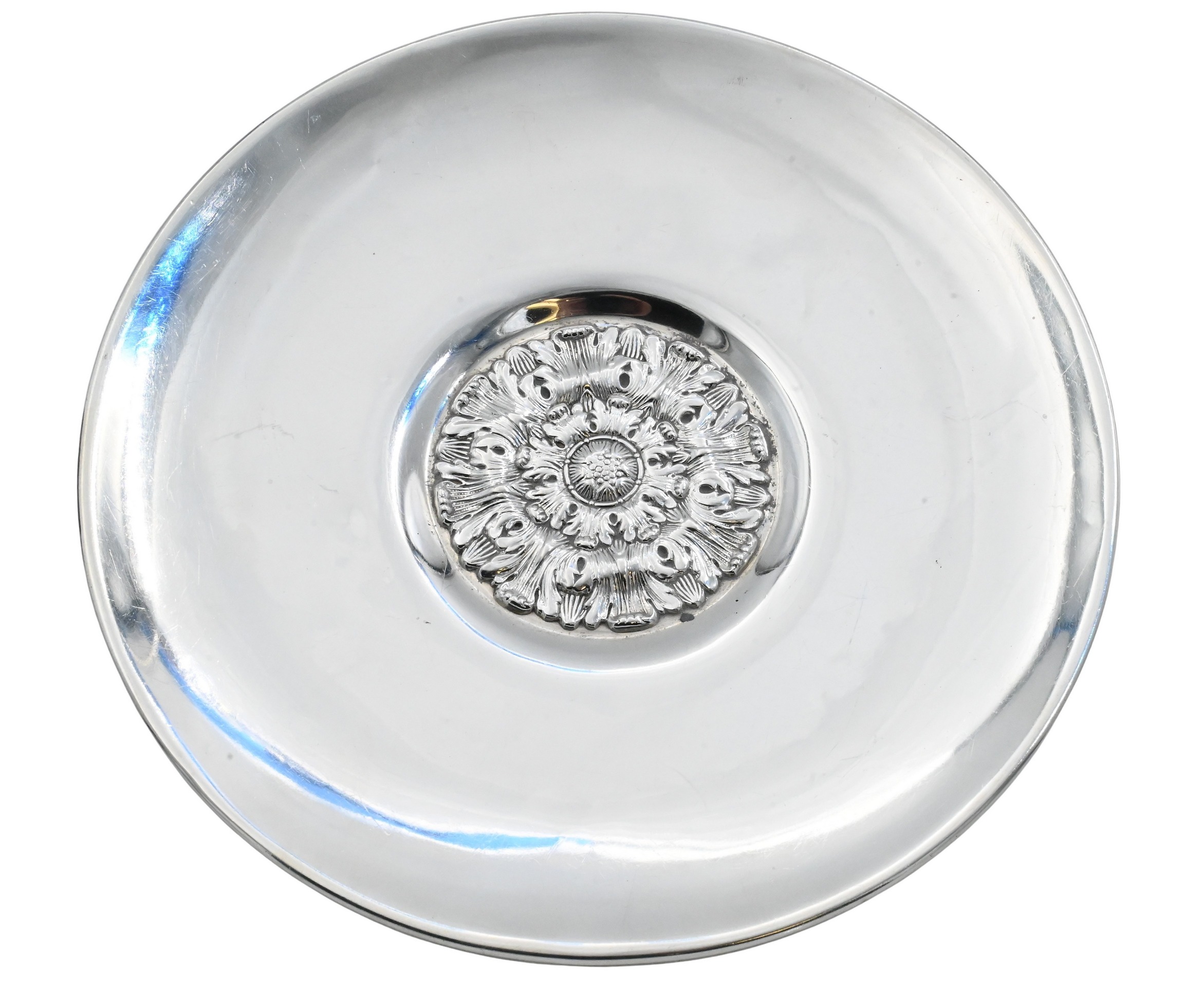 Circular form with hammered finish and central repoussé sunflower medallion. Marked Reed & Barton and Sterling.