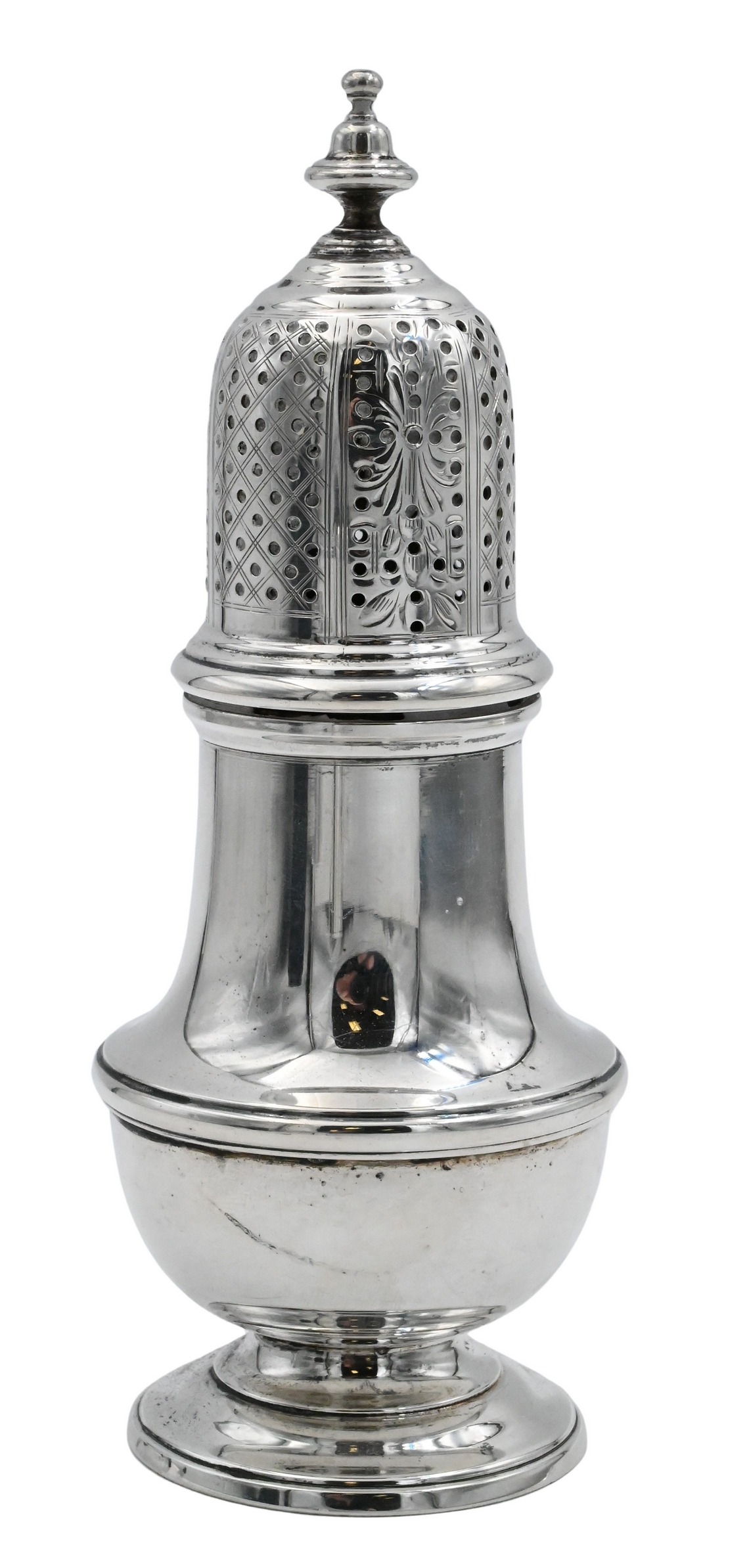 Oval pedestal-form sugar basket with bright-cut engraved banding and reeded rim, fitted with a hinged swing handle. Fully hallmarked for William Vincent, London, 1789.
