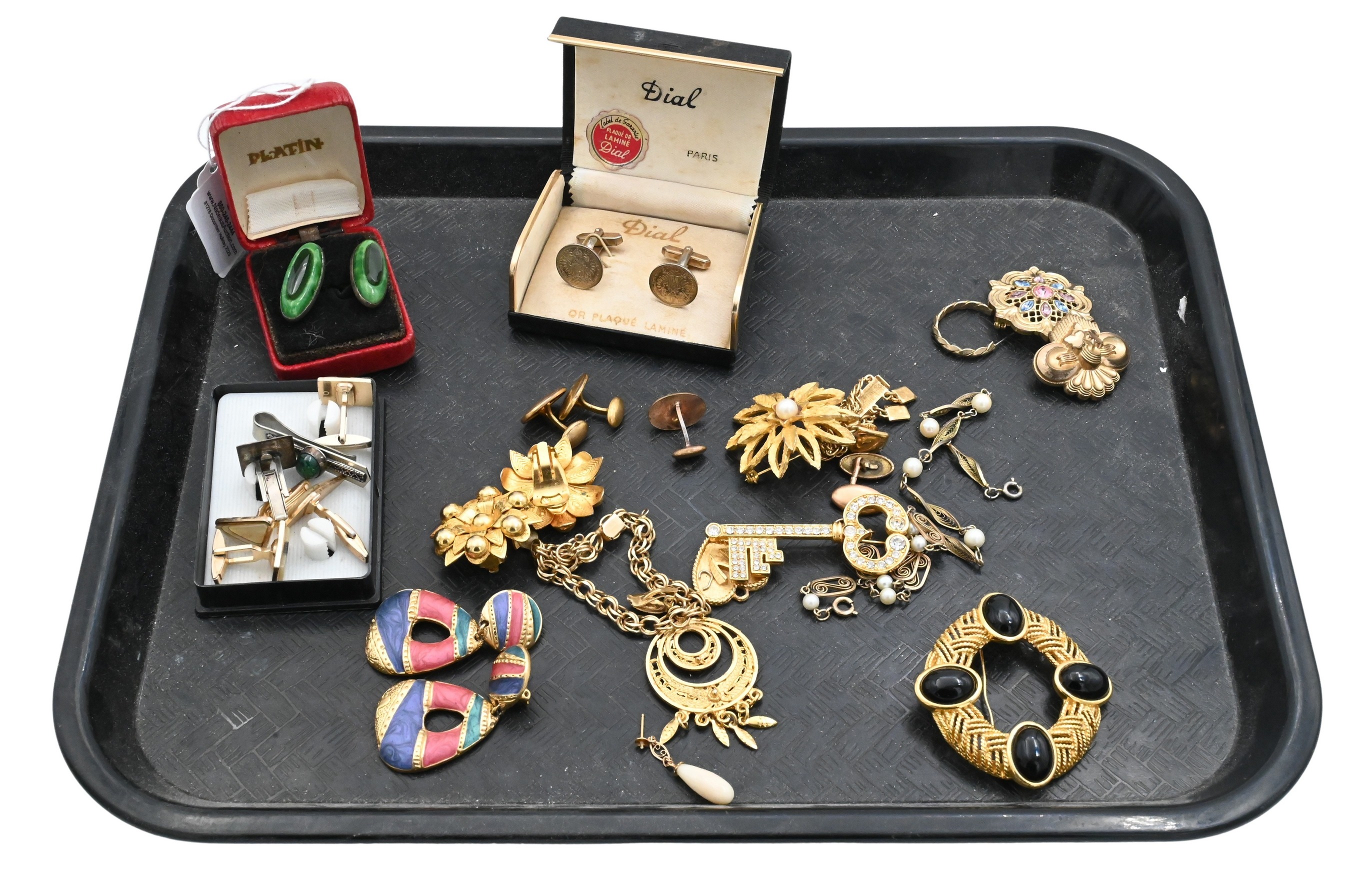 to include leaf scroll bracelet and a pair of earrings by Kremontz, a pair of gold filled cufflinks signed “B.B”, enamel pendant by Gun Scherer along with various pens, bracelets, and necklaces
