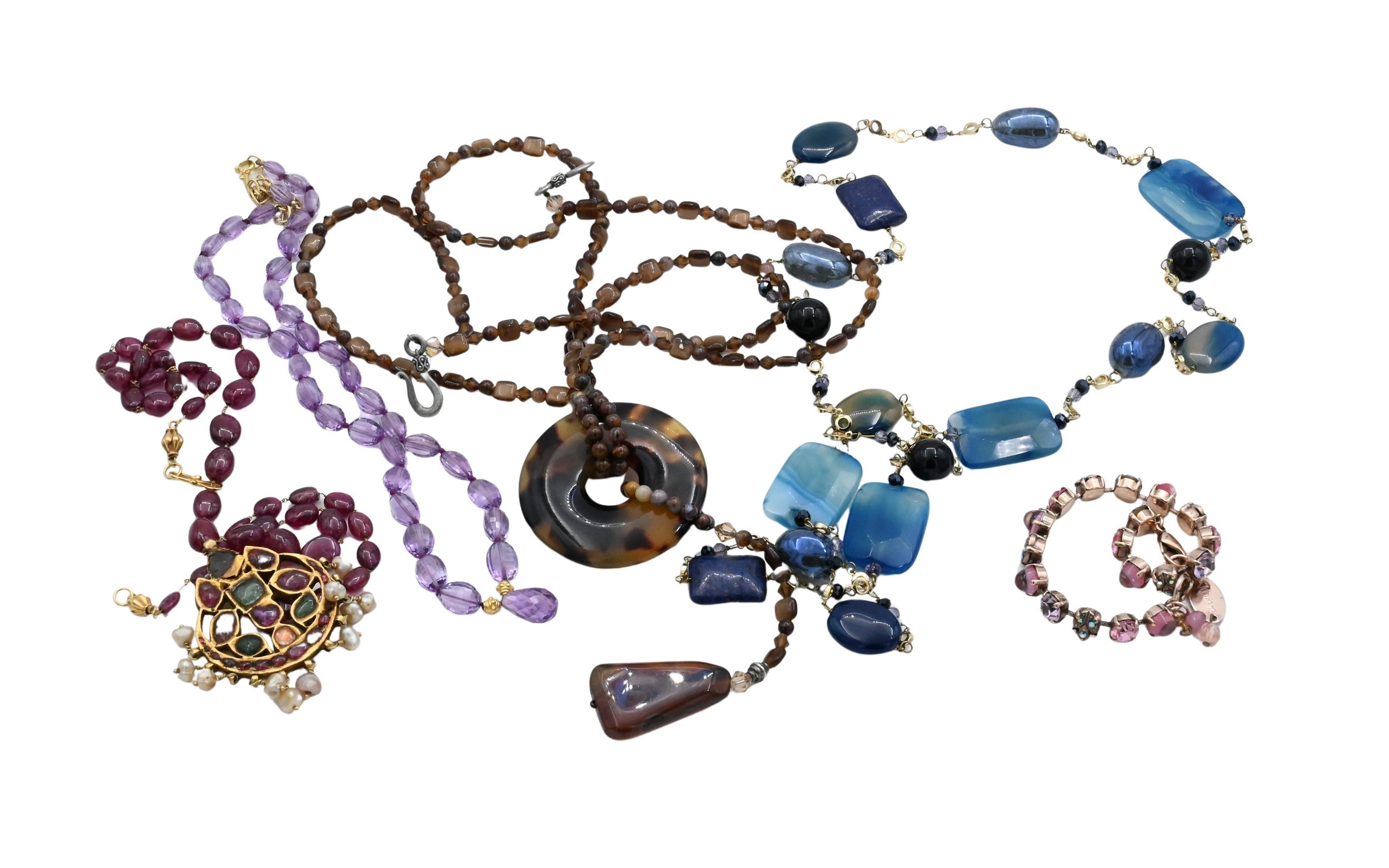 Including a Mariana pink crystal bracelet, a multi-strand faceted amber glass necklace, and various hardstone and glass bead necklaces in hues of blue, amethyst, and garnet, one with pendant drop and one with jeweled Indian-style pendant.