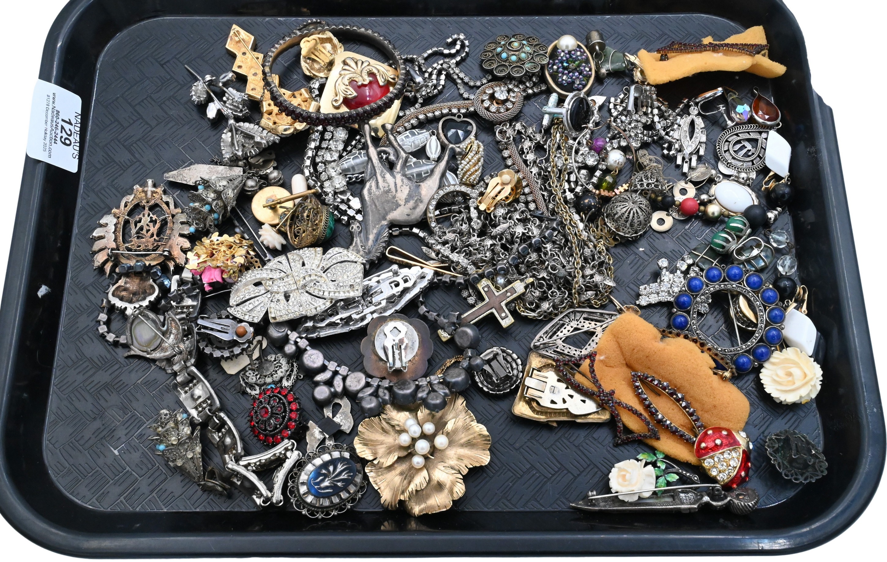 to include Aksel Holmsen sterling and enameled flower brooch having vermille, a clock pendant made into a necklace marked “Germany mayfair”, floral shaped earrings, buttons, a compact (as is), a floral brooch, etcetera