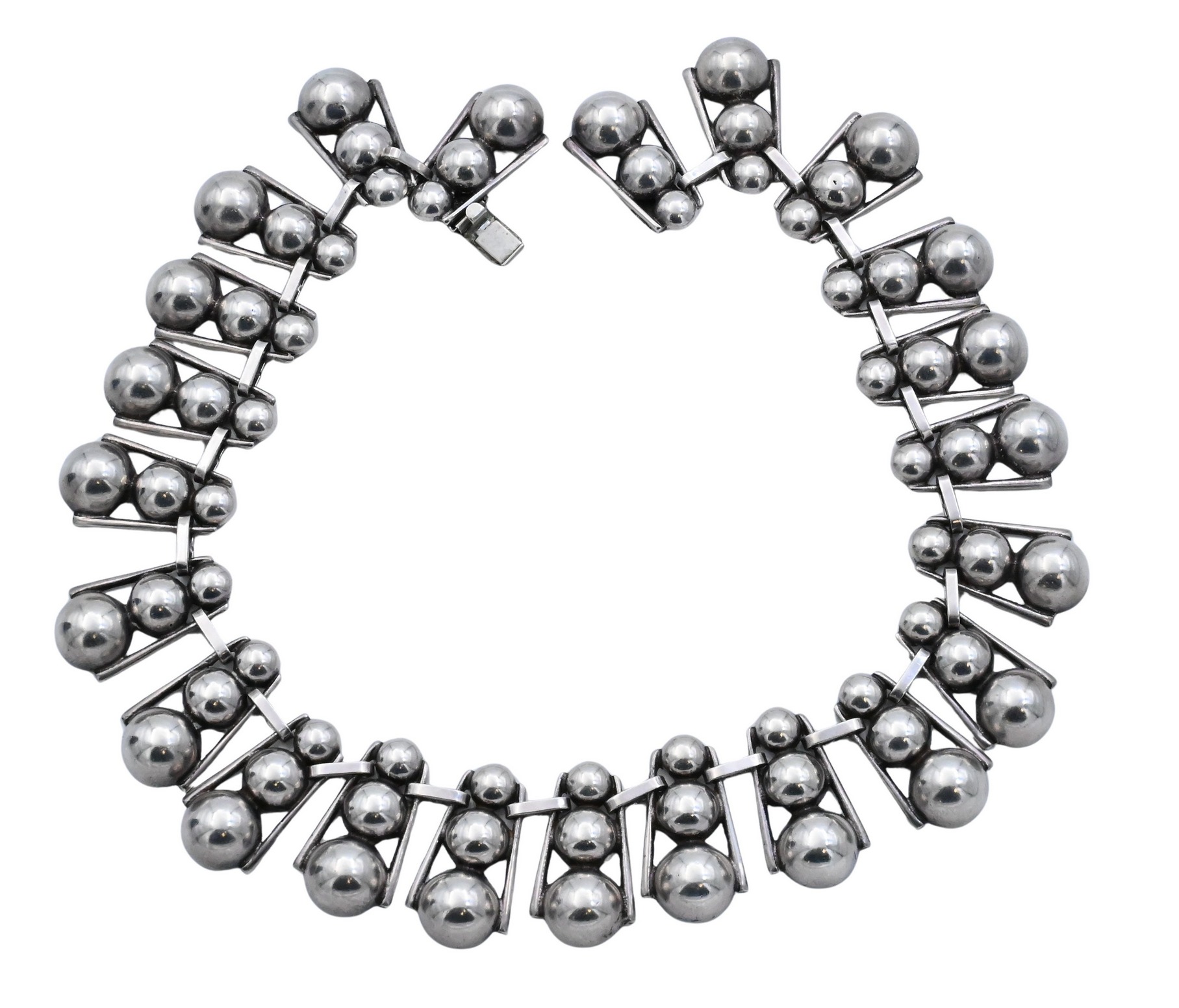 Composed of graduated double-bead links joined by angular connectors, marked Sterling on reverse.
