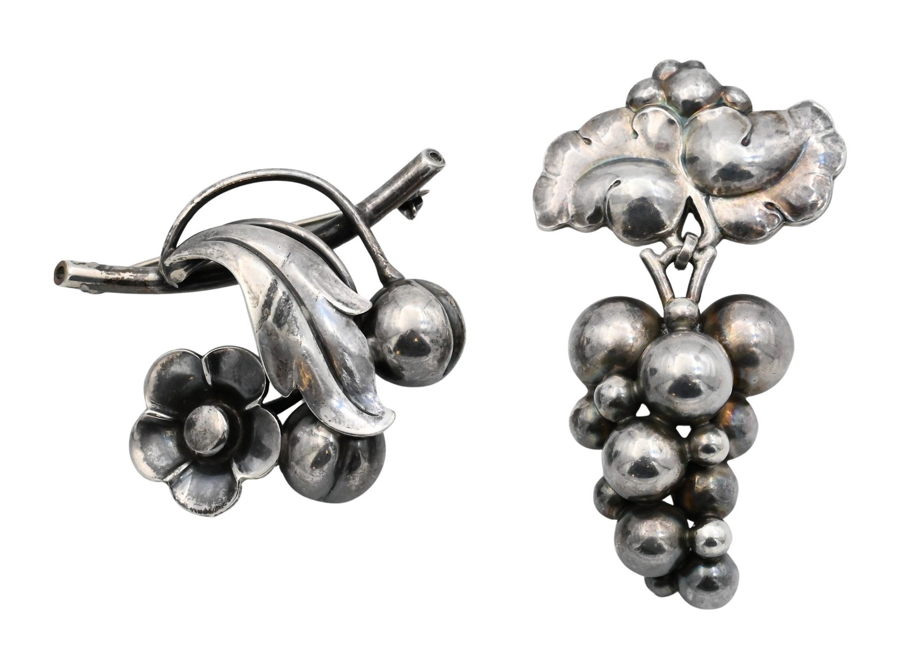 Including one Georg Jensen grape sterling silver brooch, design no. 217, Denmark, marked Georg Jensen 925S Denmark; together with one International Sterling floral brooch, marked International Sterling, Designed by J. Bellini, 234. Largest 3 inches long; total weight 1.3 t.oz..