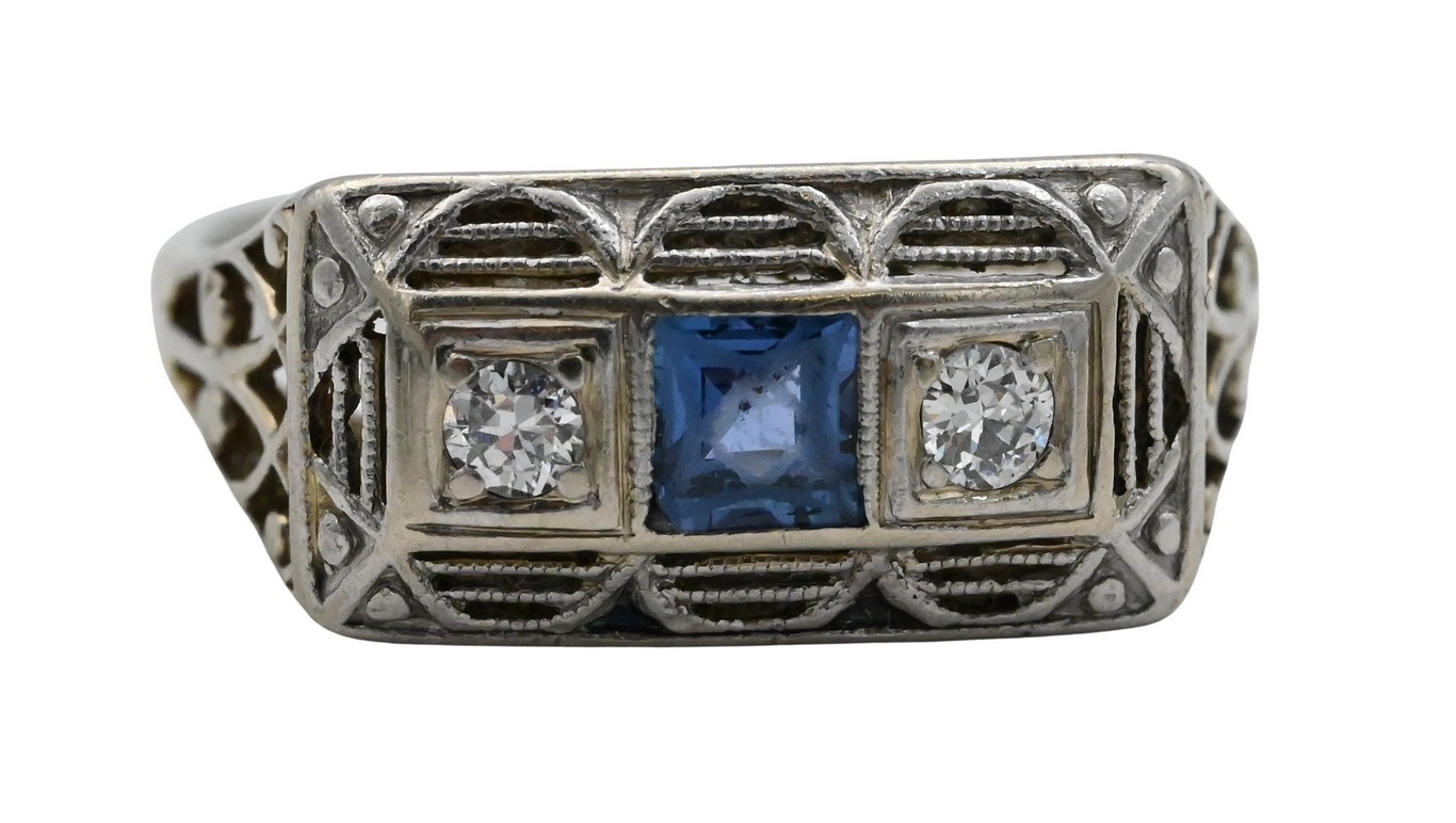 having filigree and featuring the small round diamonds flanking a square cut blue sapphire, size 4 3/4