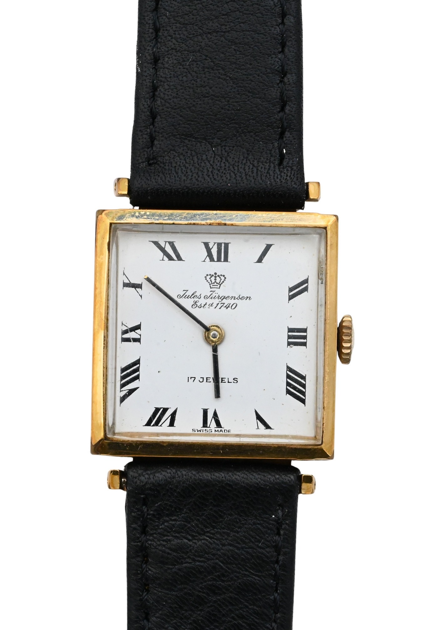 Rectangular case, 17-jewel manual-wind movement marked Jules Jürgensen Corp., Swiss made, with Roman numeral dial and black leather strap. Case with crown 27mm, total length 9 inches. Includes original Jules Jürgensen presentation box.
