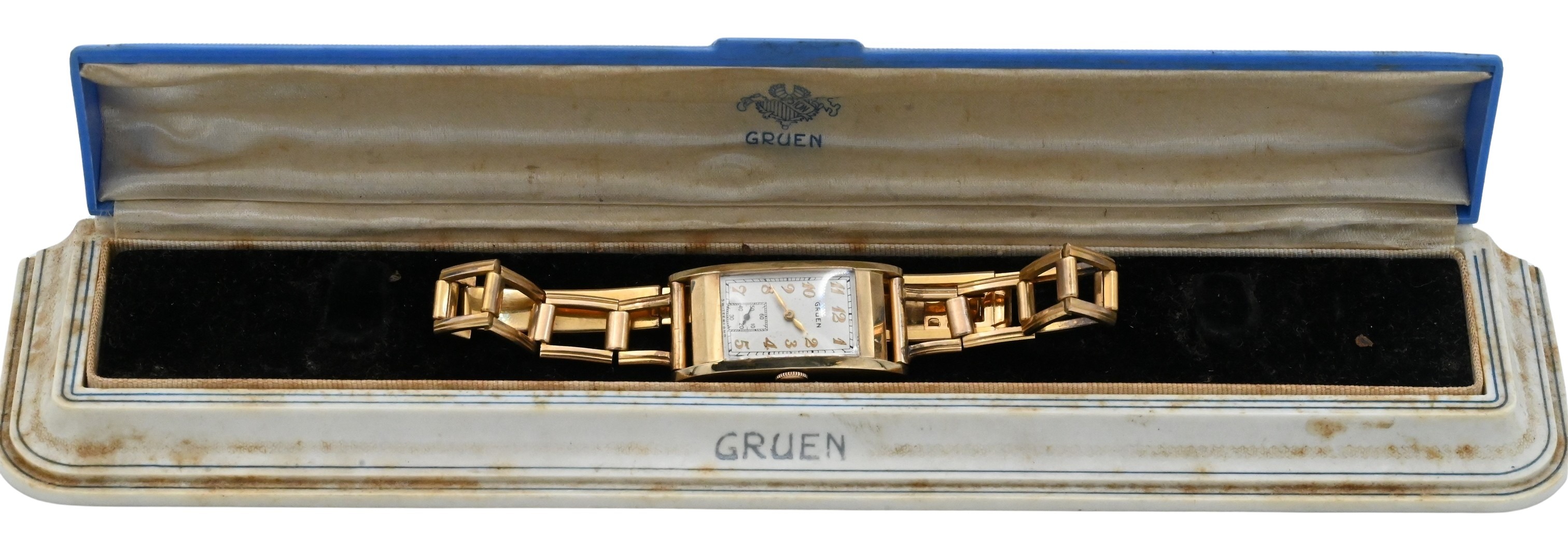 Rectangular case marked Gruen Watch Co., Switzerland, 500 cal., 17-jewel movement, case interior marked 14K Solid Gold, band marked Simmons Gold-Filled. Case 40mm x 20mm. Total weight 36.8g. Includes original Gruen presentation box.