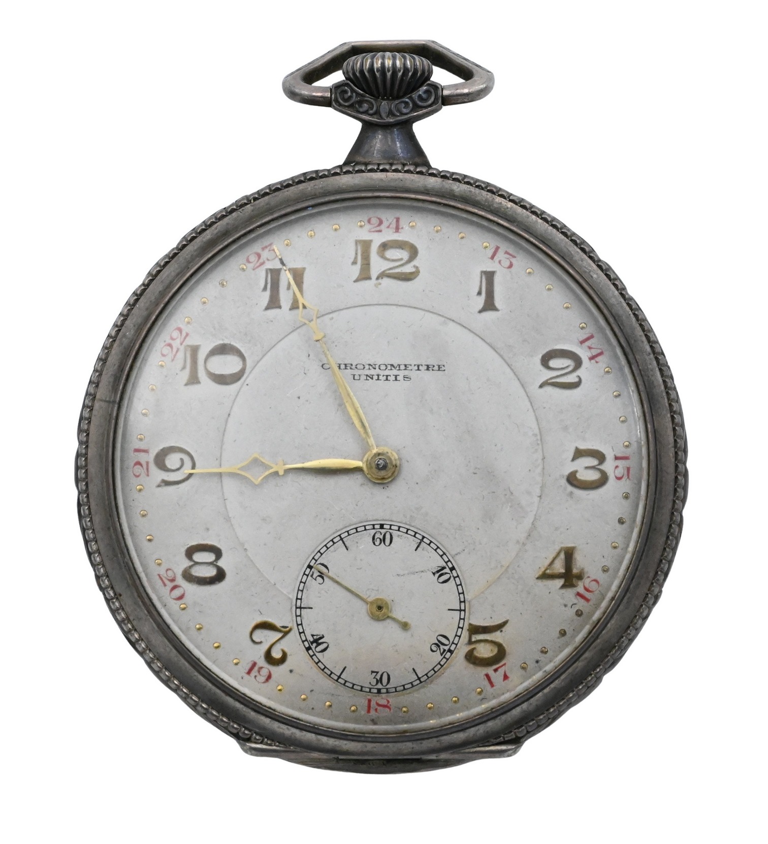 Marked Chronomètre Unité to the dial, with Arabic numerals, subsidiary seconds dial, and gilt hands within a silver case stamped 800 and numbered 1565. The interior case bears additional Swiss hallmarks.