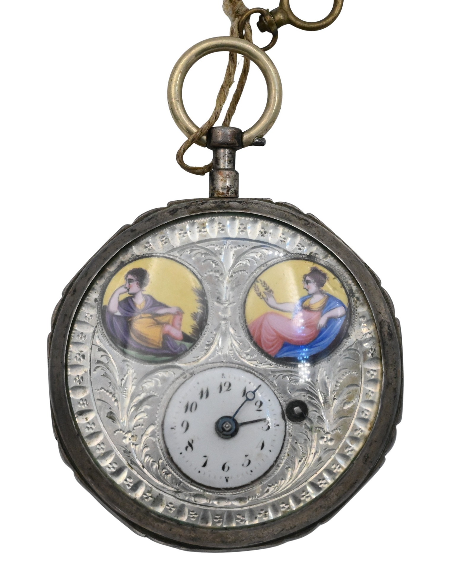 17th-18th century, Silver open-face pocket watch, 2 inches in diameter, featuring an elaborately engraved and engine-turned dial plate inset with two hand-painted polychrome enamel scenes of classical figures and a small white enamel time dial with Roman numerals. The gilt verge fusee movement with pierced and foliate balance clock, numbered 18758 and stamped II / HV to inner case. Retains original key.
