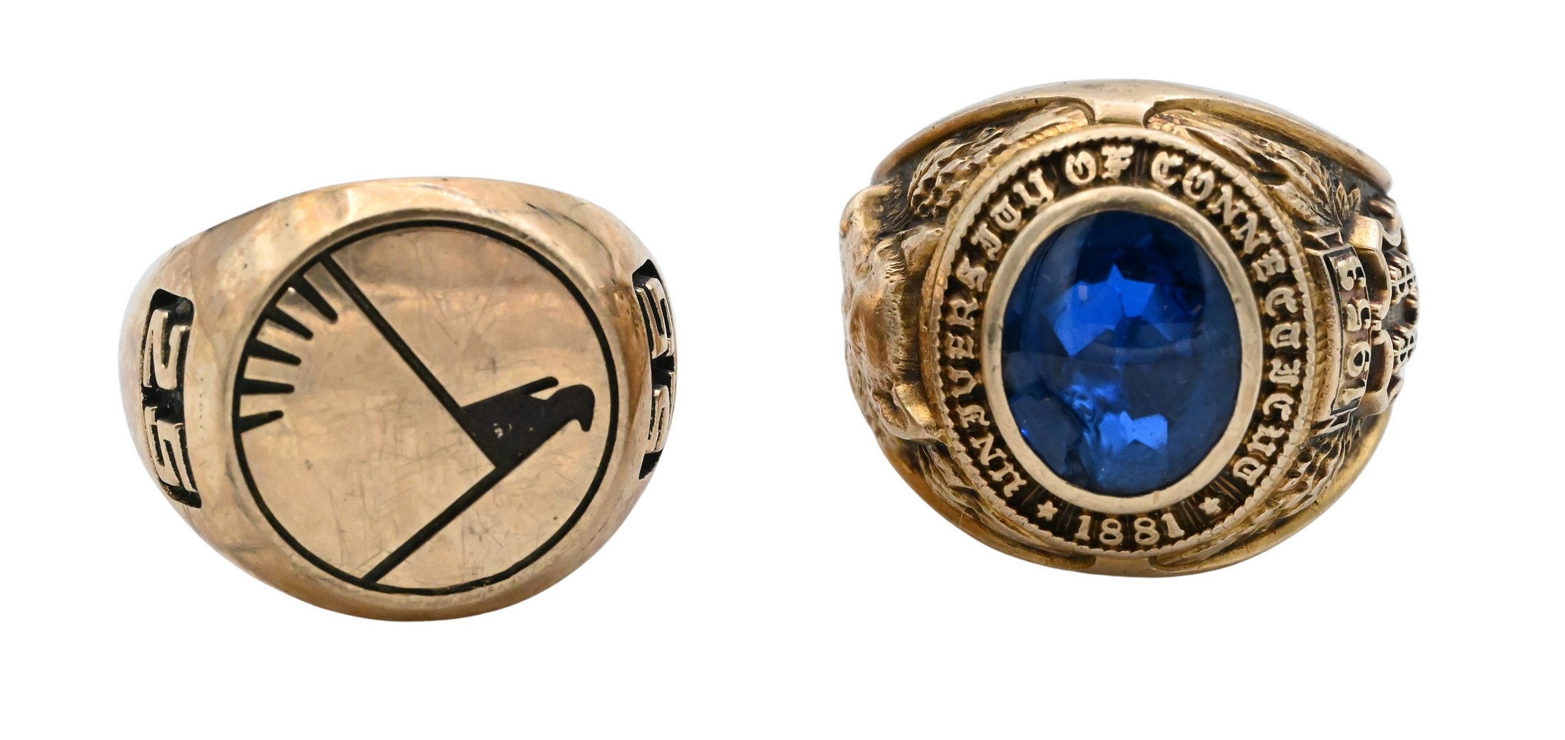 one for the University of Connecticut with blue stones and one signet with stylized bird