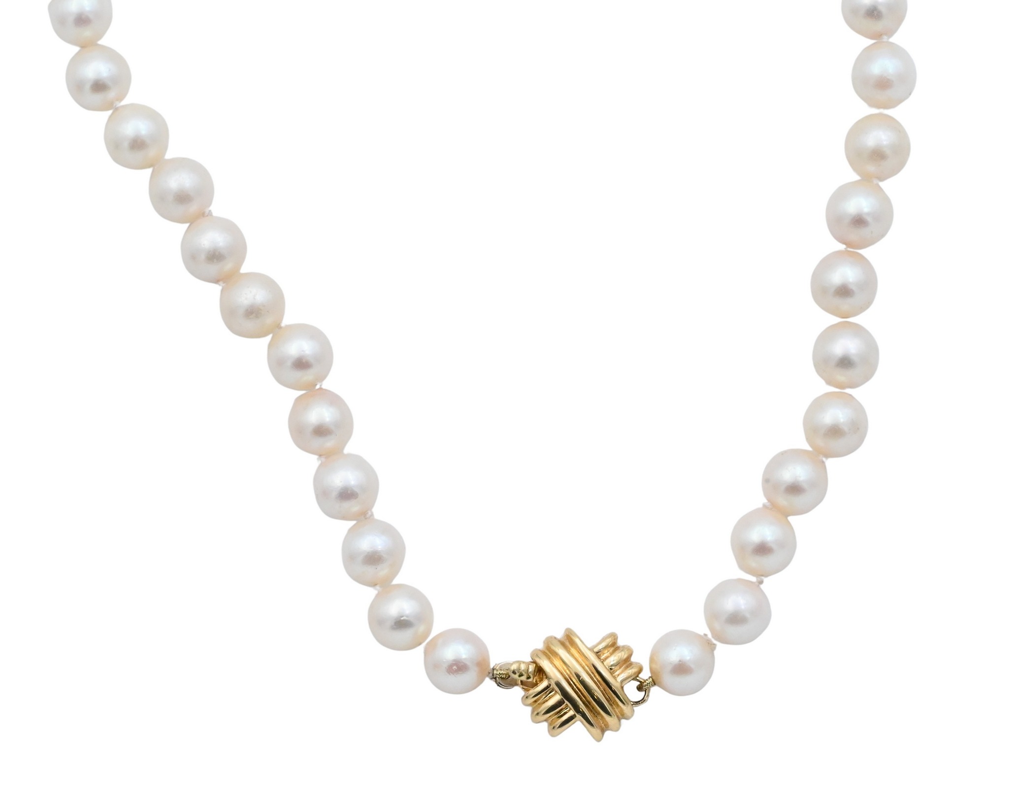 Single strand of near-round cultured pearls measuring approximately 7.3mm in diameter, completed by a ribbed 18K yellow gold clasp marked T.&Co. 750.