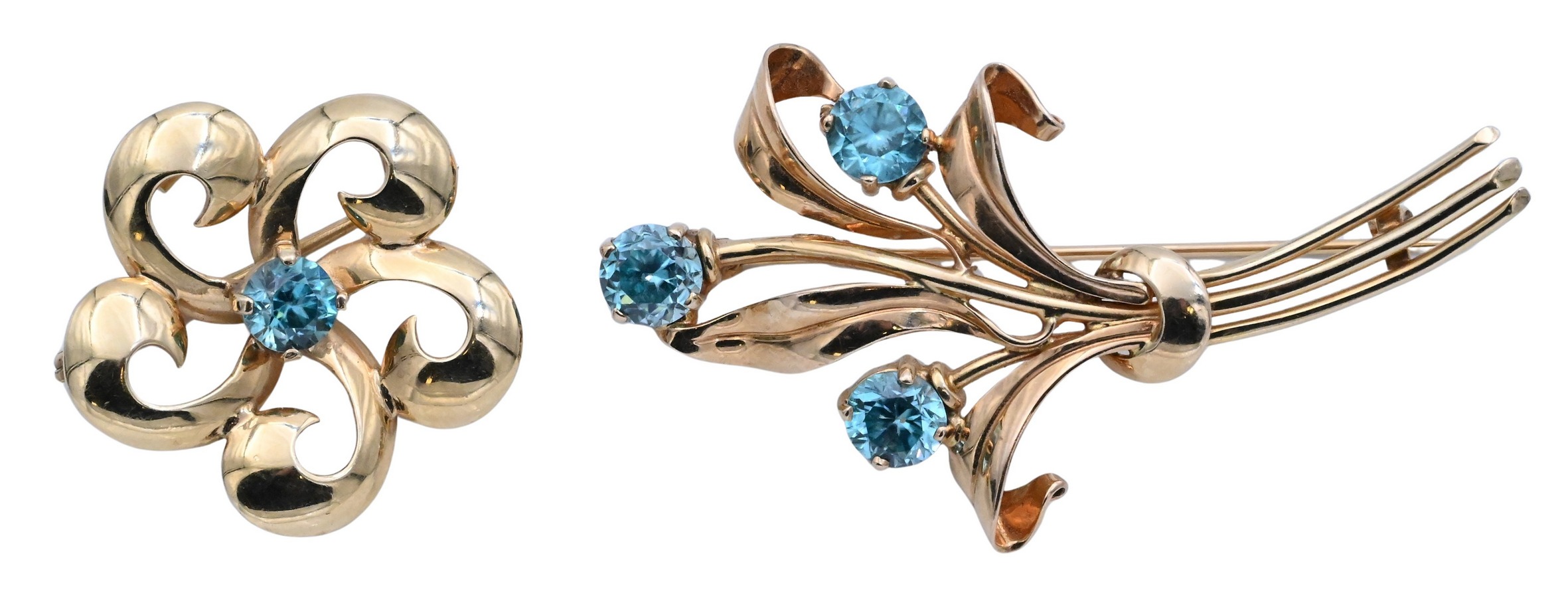 Measures 1 × 1¼ inches; total weight 6.3 grams., and a circular floral brooch accented with seed pearls and small diamonds; two marked “14K.