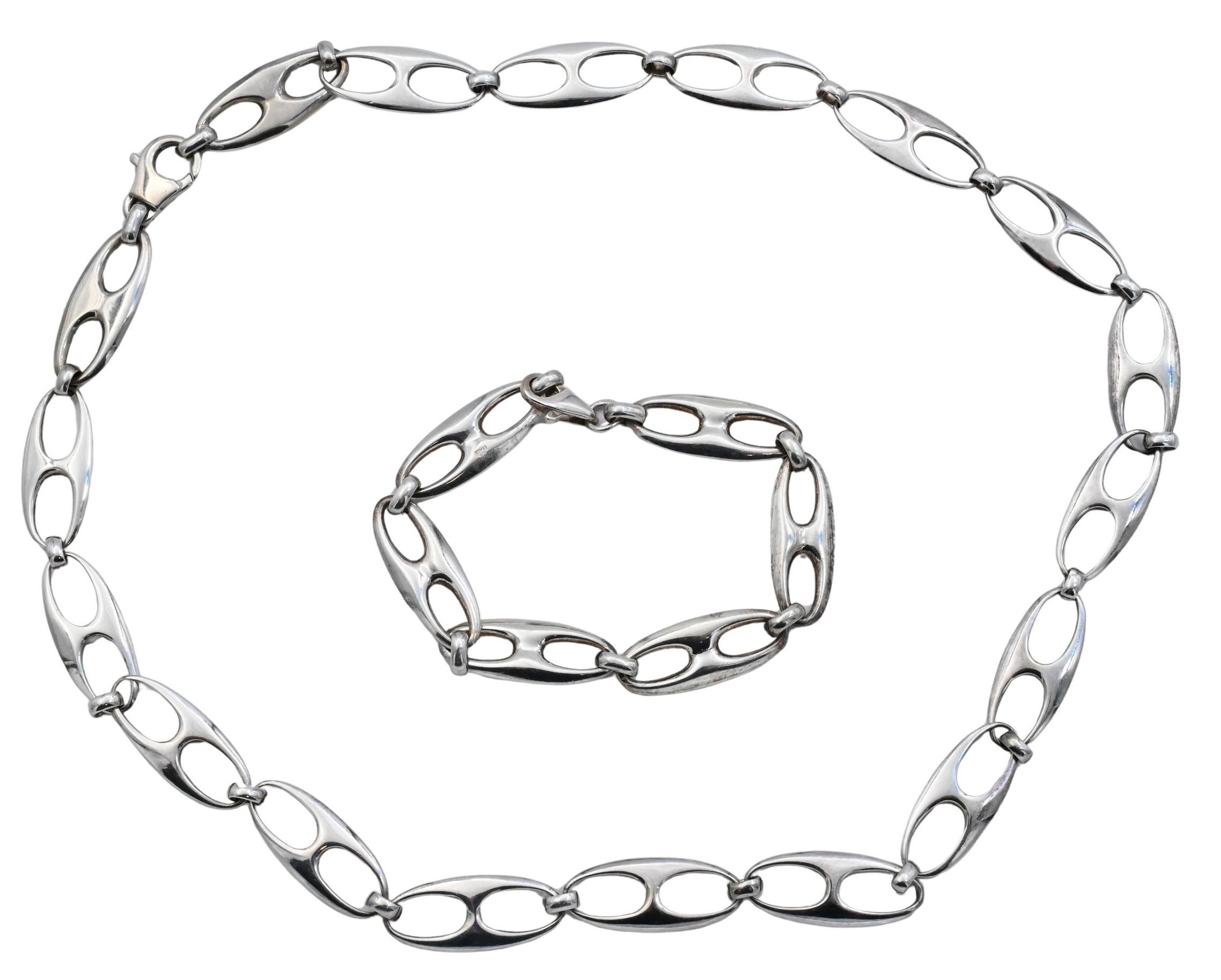 Comprising a matching necklace and bracelet, each formed of elongated oval open-link elements with high-polish finish and lobster clasps. Both marked 925 Italy. Modern, sculptural design with fluid linked construction.