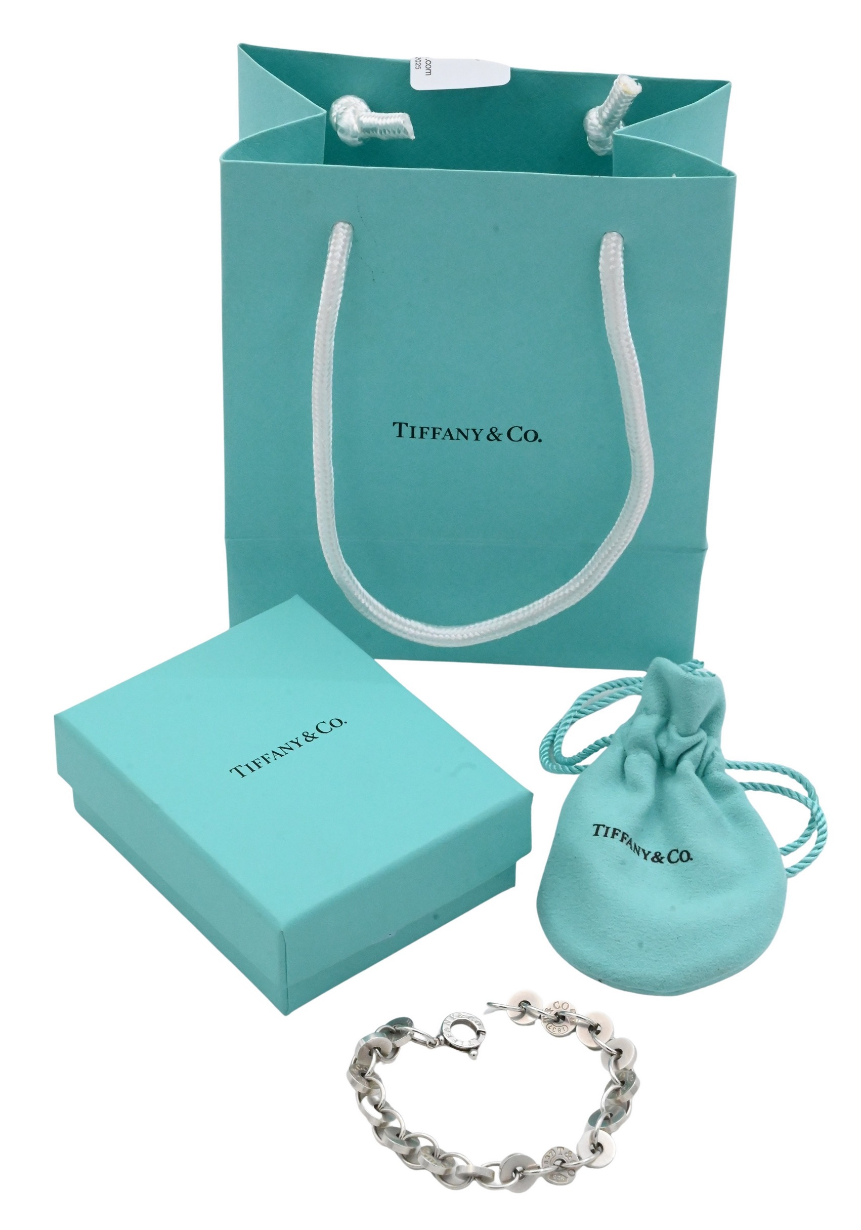 Composed of circular links engraved “T & Co. 1837,” with toggle-style design and Tiffany & Co. hallmarks. Includes original Tiffany velvet pouch, presentation box, and gift receipt