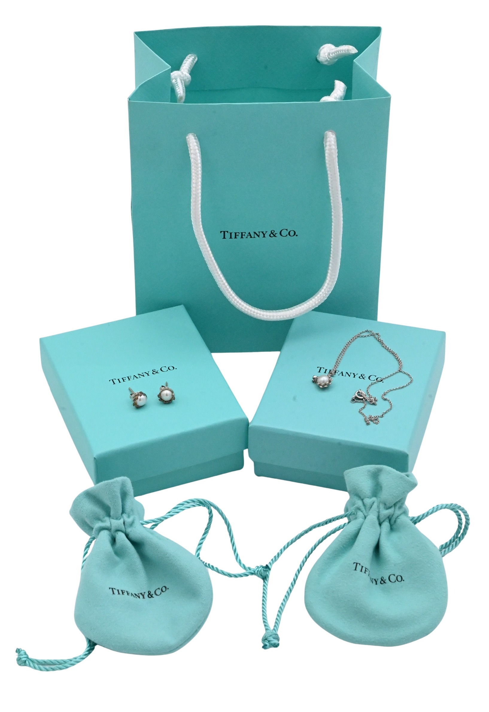Comprising a delicate chain necklace and matching stud earrings, each featuring a cultured pearl encased in Paloma Picasso’s signature “Olive Leaf” sterling silver motif. Hallmarked “Tiffany & Co. 925.” Includes original Tiffany boxes, original velvet presentation pouches, a gift receipt, and the original shopping bag.