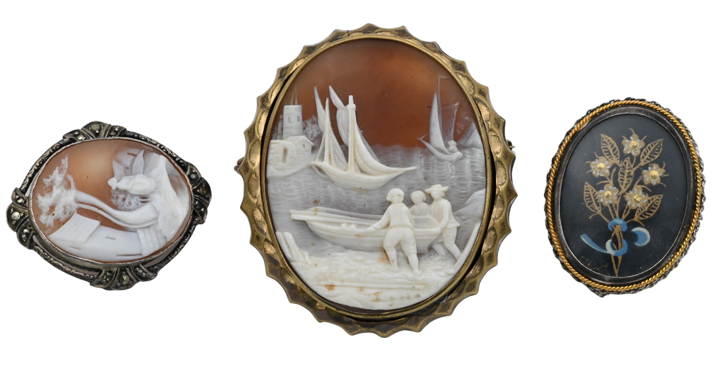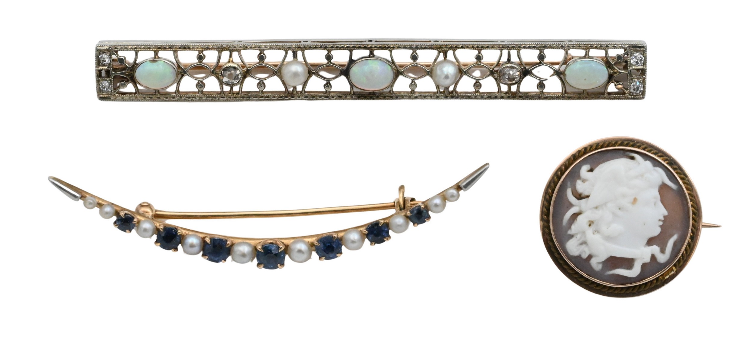 Including one 14K yellow gold bar pin set with opals, seed pearls, and small diamonds, one 14K yellow gold curved pin set with alternating sapphires and seed pearls; and one 10k yellow gold circular cameo pin depicting a classical female profile in relief.largest length 2¾ inches