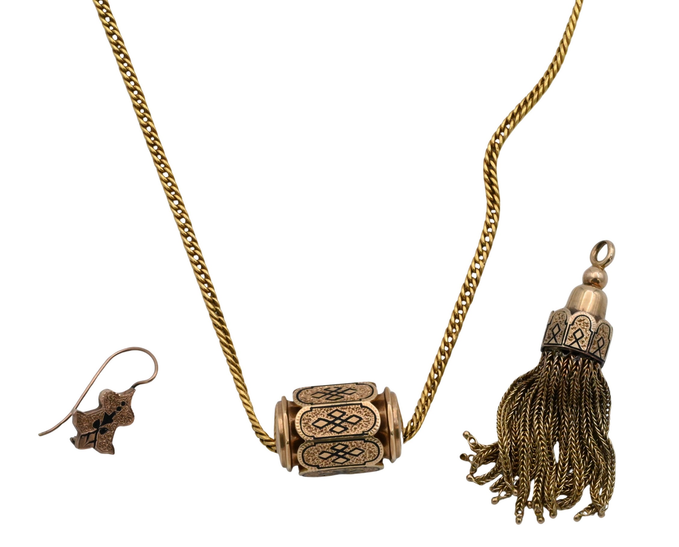 to include single enamel earring, necklace with enamel drawn form slide, and enameled tassel pendant