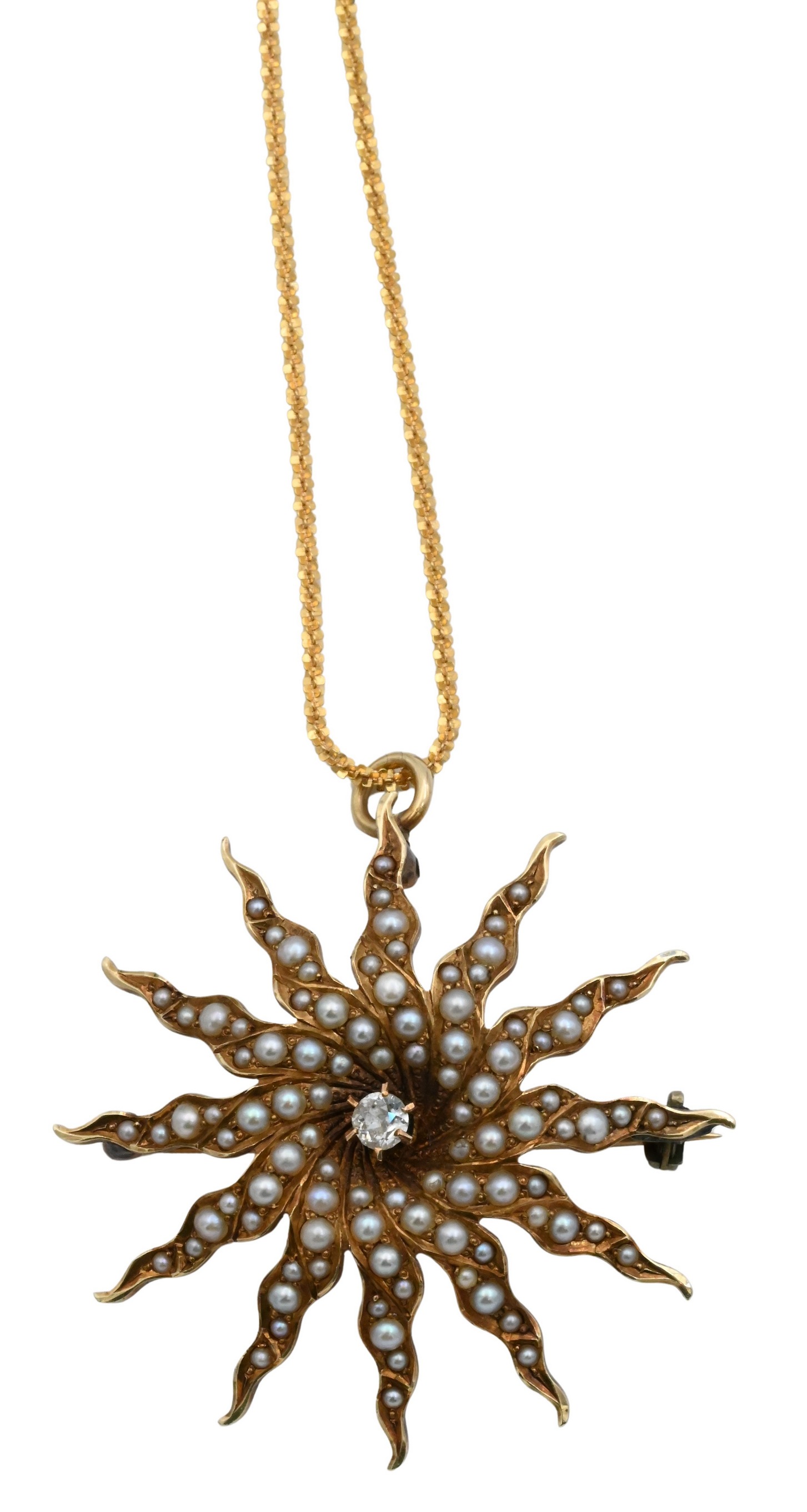 14K yellow gold starburst pendant set with seed pearls and a central diamond, suspended from a 14K Italian gold chain.