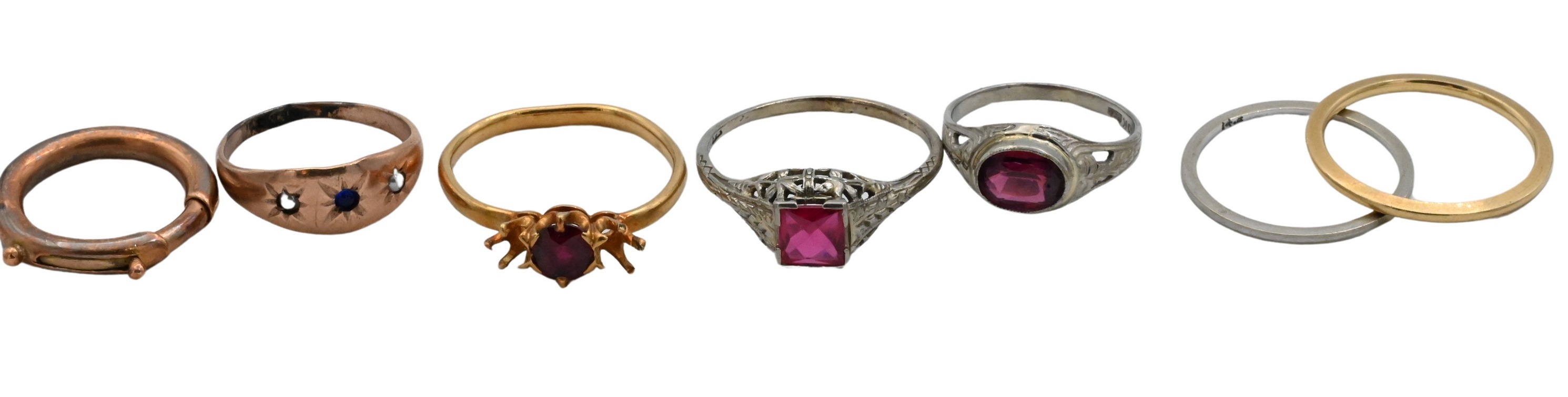 Including three class rings, an engraved band, a ring set with red stones (one missing), a plain band, and a solitaire mounting