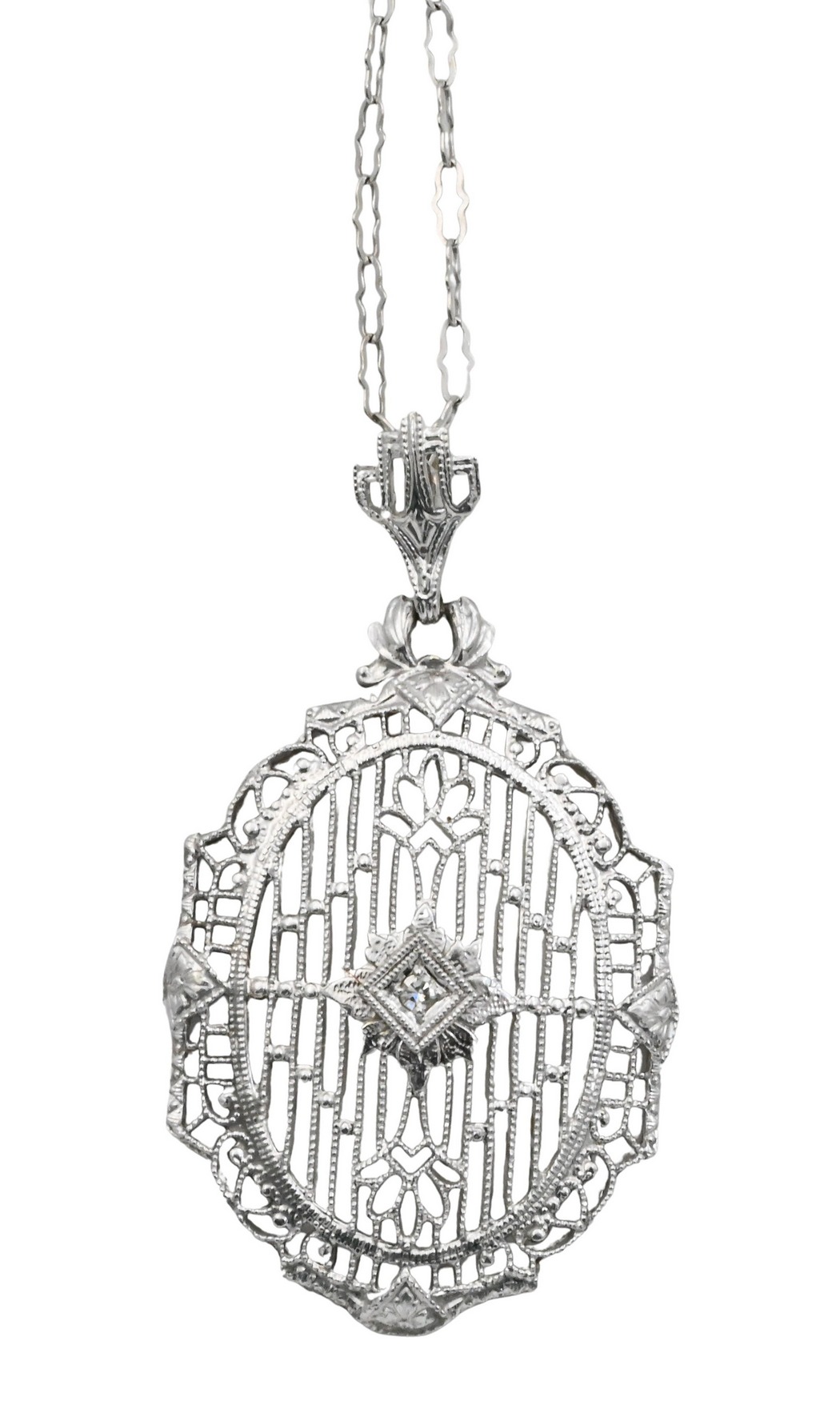 Art Deco–style 14K white gold filigree pendant centering a small diamond, on a matching 14K white gold chain.