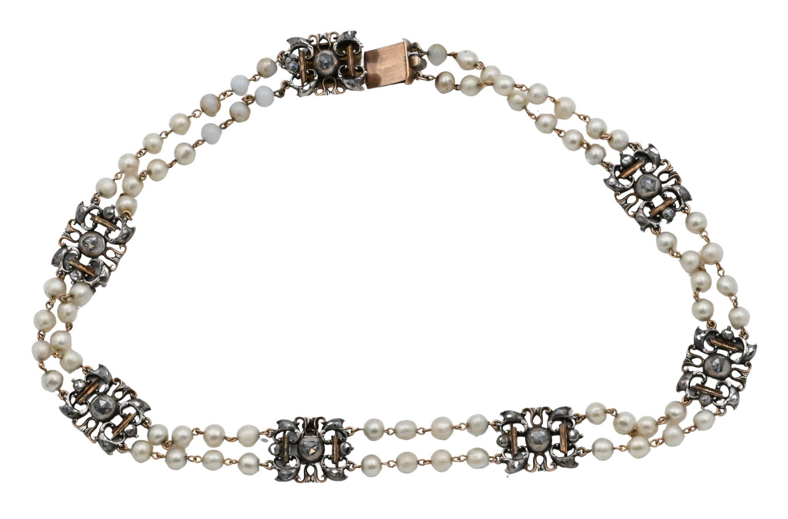 having rose cut diamonds bezel set in silver overlaid gold on a double strand of pearls, some pearls with loss to luster